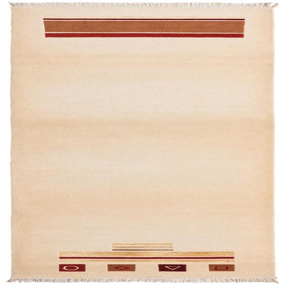 The Darya Collection presents a 10-foot runner rug, handcrafted with a blend of wool and cotton, offering a durable yet soft pile with a comforting underfoot feel. This runner features a simplified and impactful design, emphasizing geometric accents in a selection of warm and earthy tones. The beige background delivers a neutral canvas, which is tastefully highlighted by linear gestures in colors such as brown, burgundy, gold, light brown, tan, and rust red.