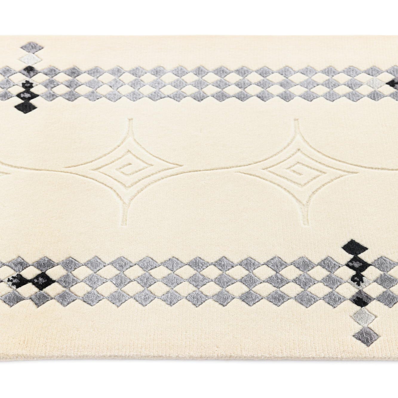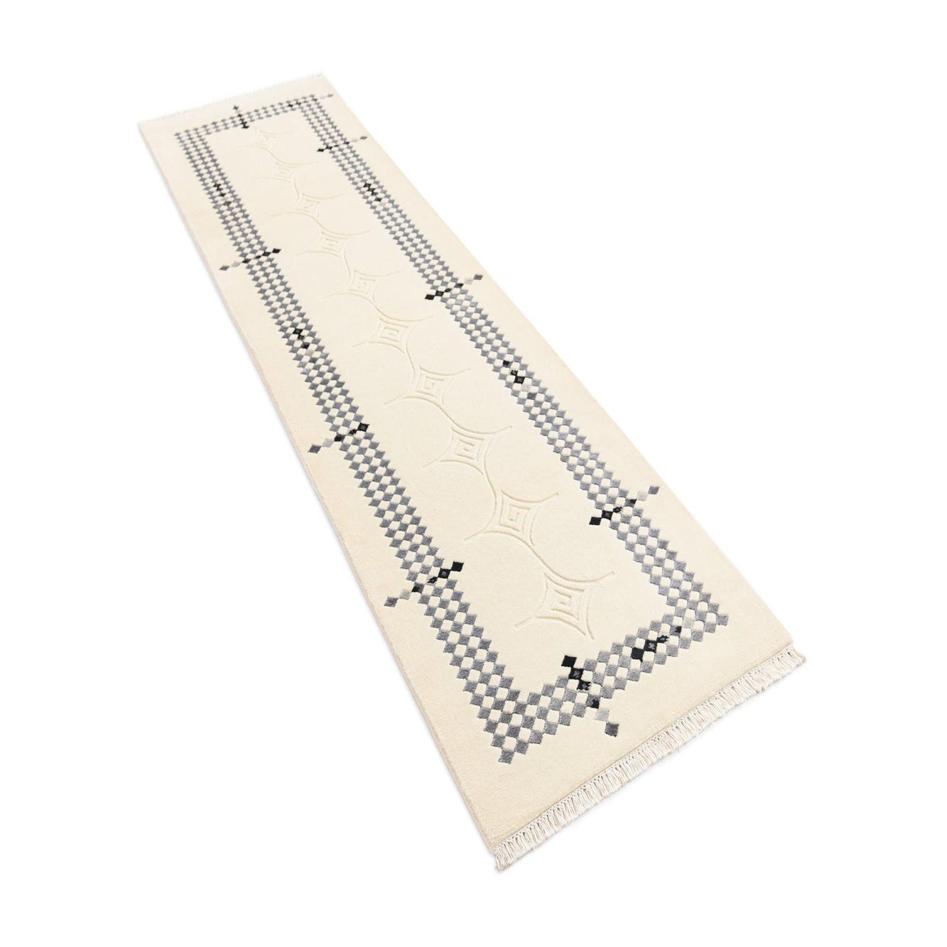 Hand-made from wool and cotton, this runner rests on a warm beige field with a linear arrangement of carved geometric medallions running down the center. The low-profile pile offers a soft, tactile surface while the tone-on-tone ivory carving provides subtle relief. A narrow border of small diamond/checker motifs in gray and ivory frames the piece, with deliberate black accent clusters that add graphic contrast. Short fringe at the ends completes the look.