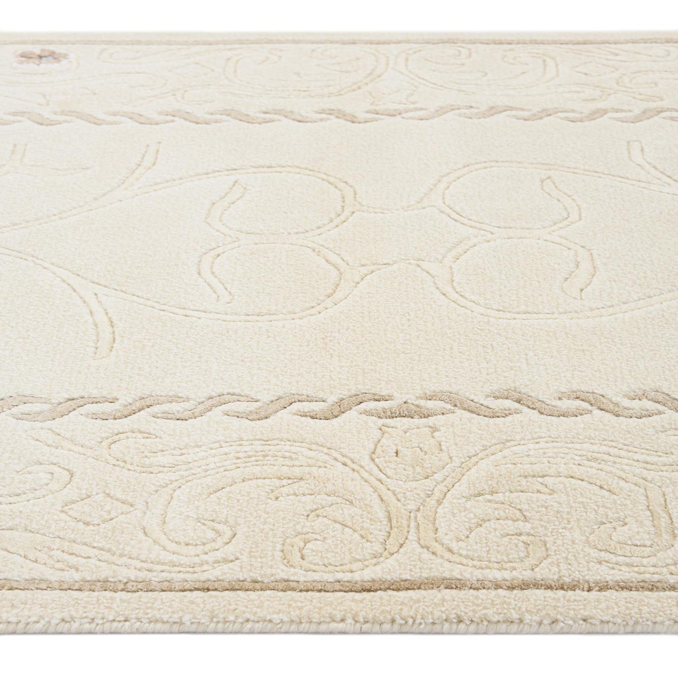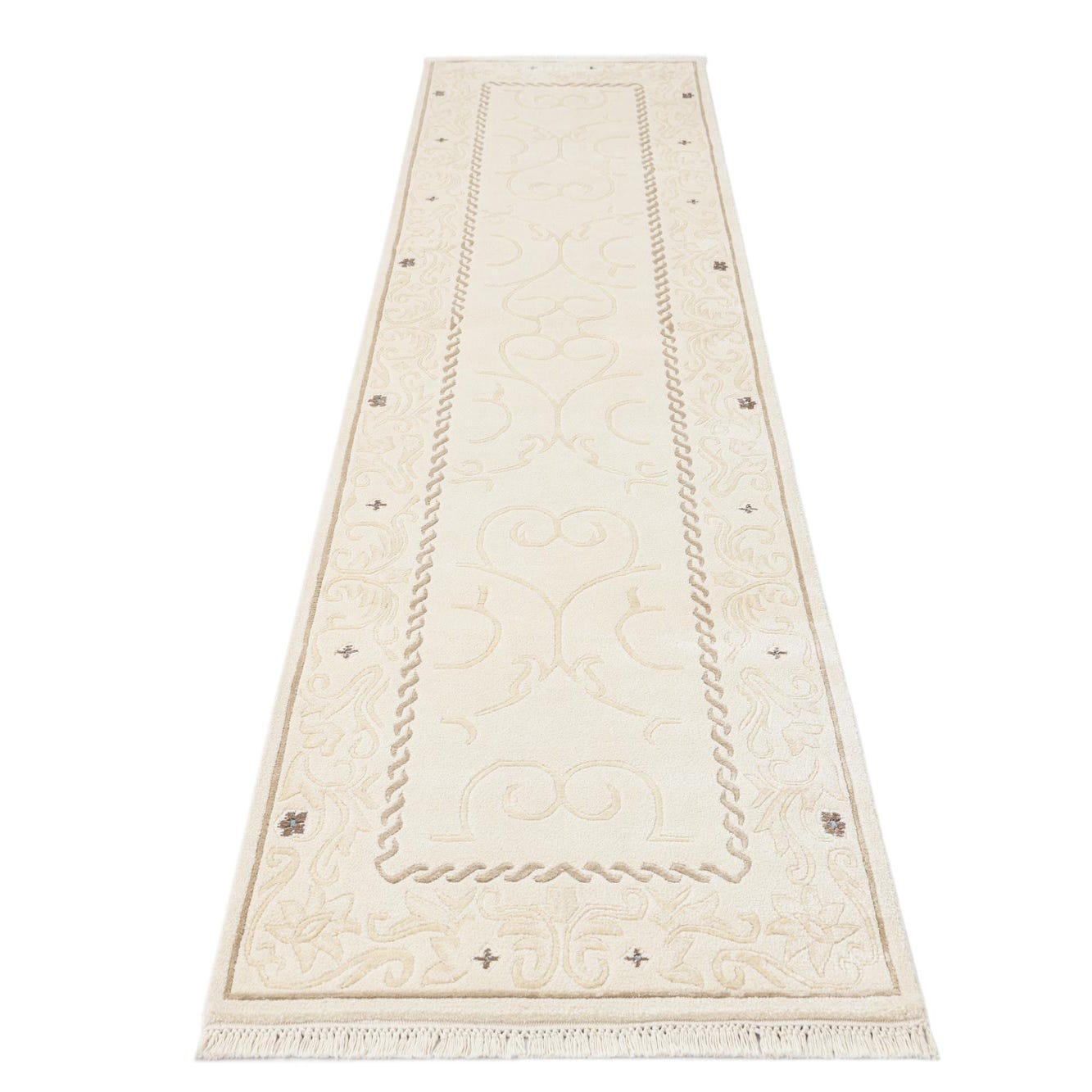 A 10 ft Darya runner rug in cream and tan wool, featuring a modern oriental pattern with a braided border, ideal for a hallway.