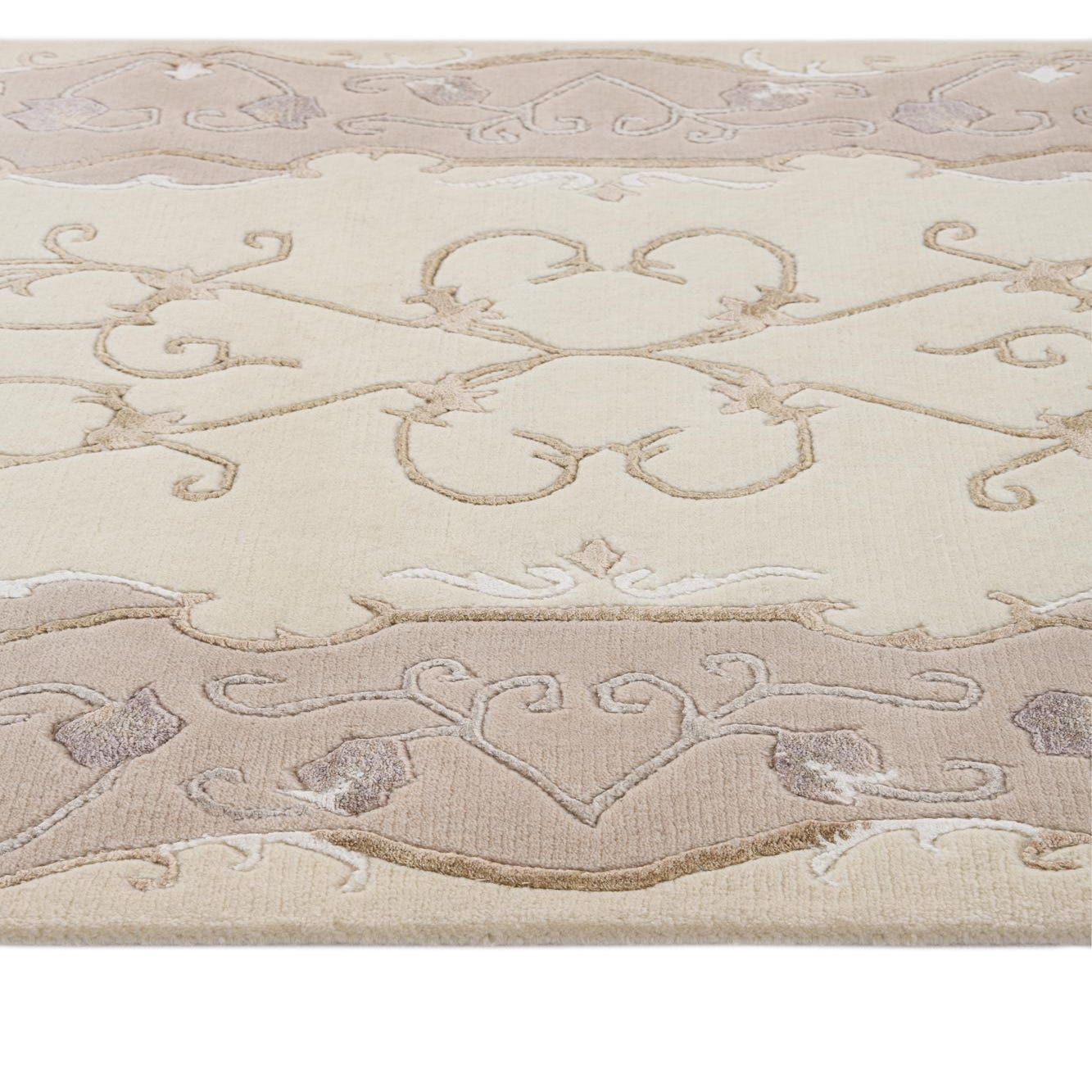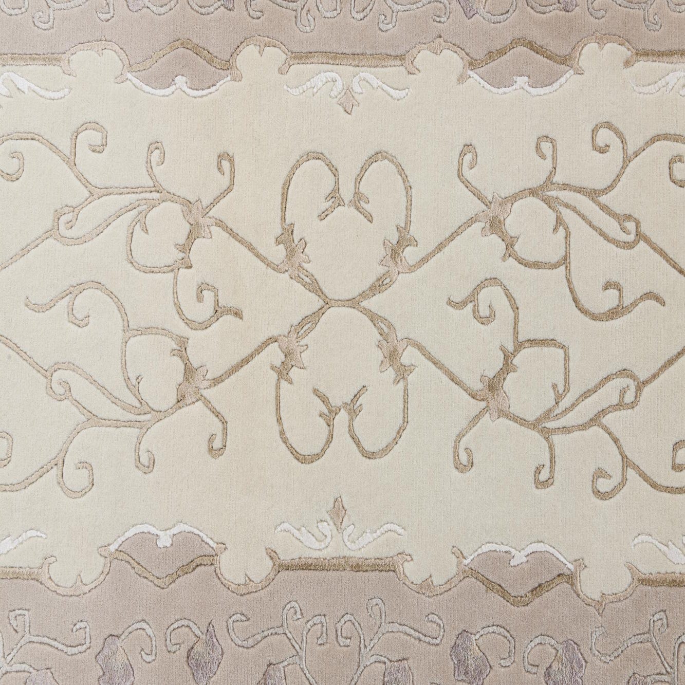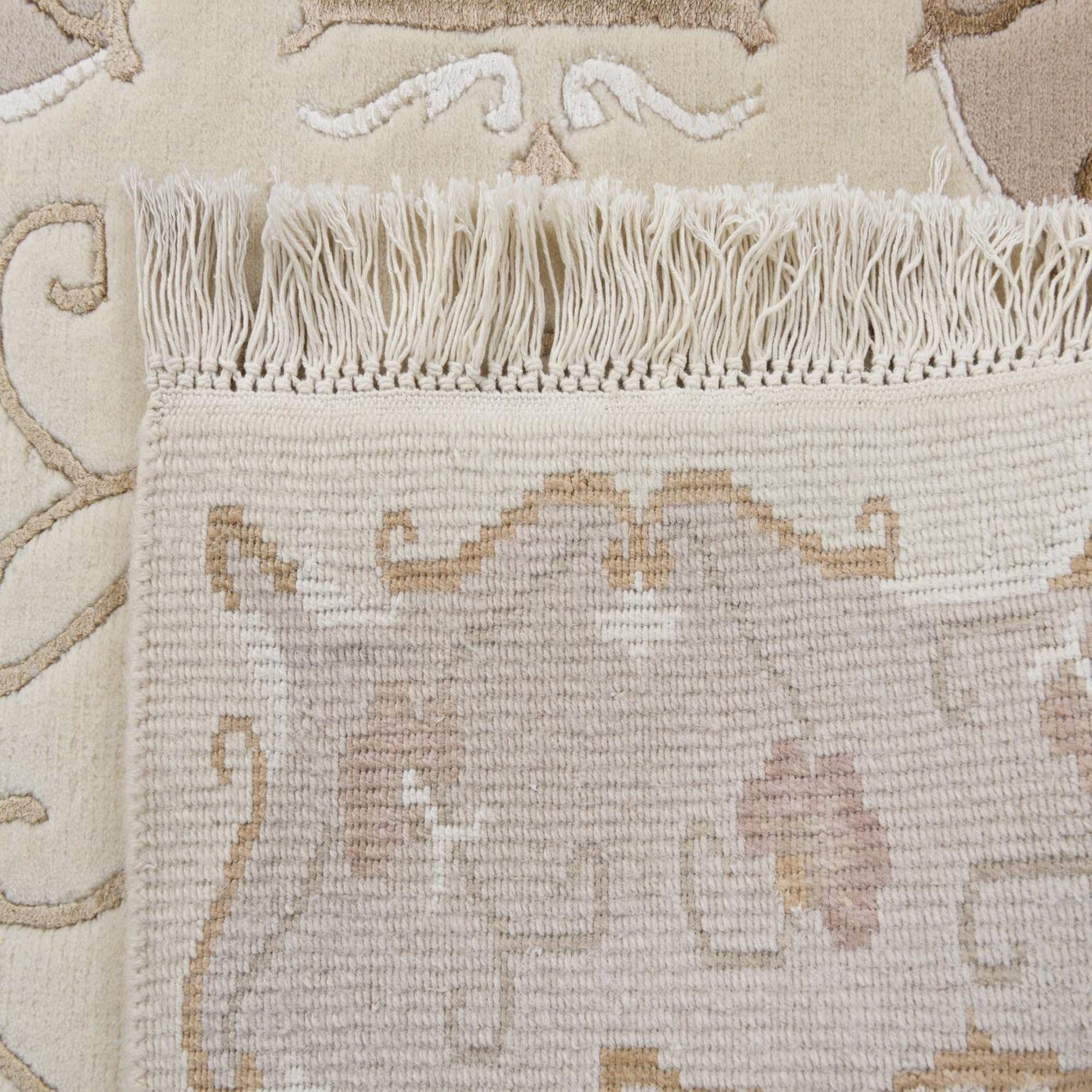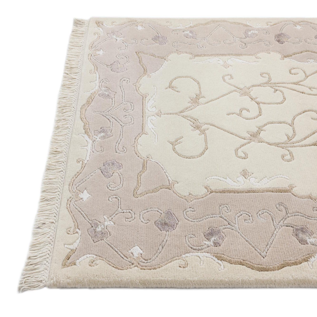 The Darya collection presents a sophisticated 10 Ft Runner rug, hand-knotted using 100% wool for enduring quality and tactile comfort. This carpet displays an elegant interplay of neutral tones including beige, tan, light brown, and ivory that contribute to its versatile appeal. The background of the rug is a warm beige, setting a serene foundation for the decorative framework.