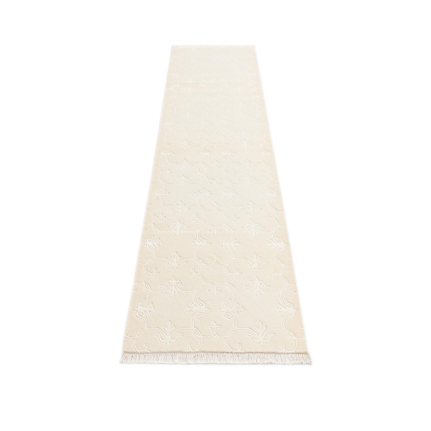 The Darya Collection 10 Ft Runner is a hand-knotted rug, meticulously crafted from 100% wool. Its design features a series of interconnected, elegant motifs that create a harmonious lattice pattern across the rug's surface. The use of beige as the background color, coupled with soft ivory detailing, offers a neutral but warm palette that facilitates integration into a wide range of interior styles.