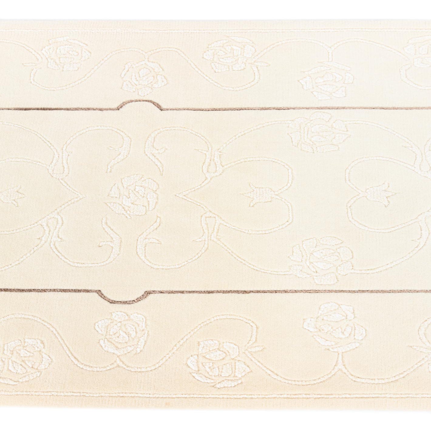 A 10 ft Darya runner rug in shades of ivory and tan, featuring a modern oriental floral pattern with a brown border, suitable for a hallway.