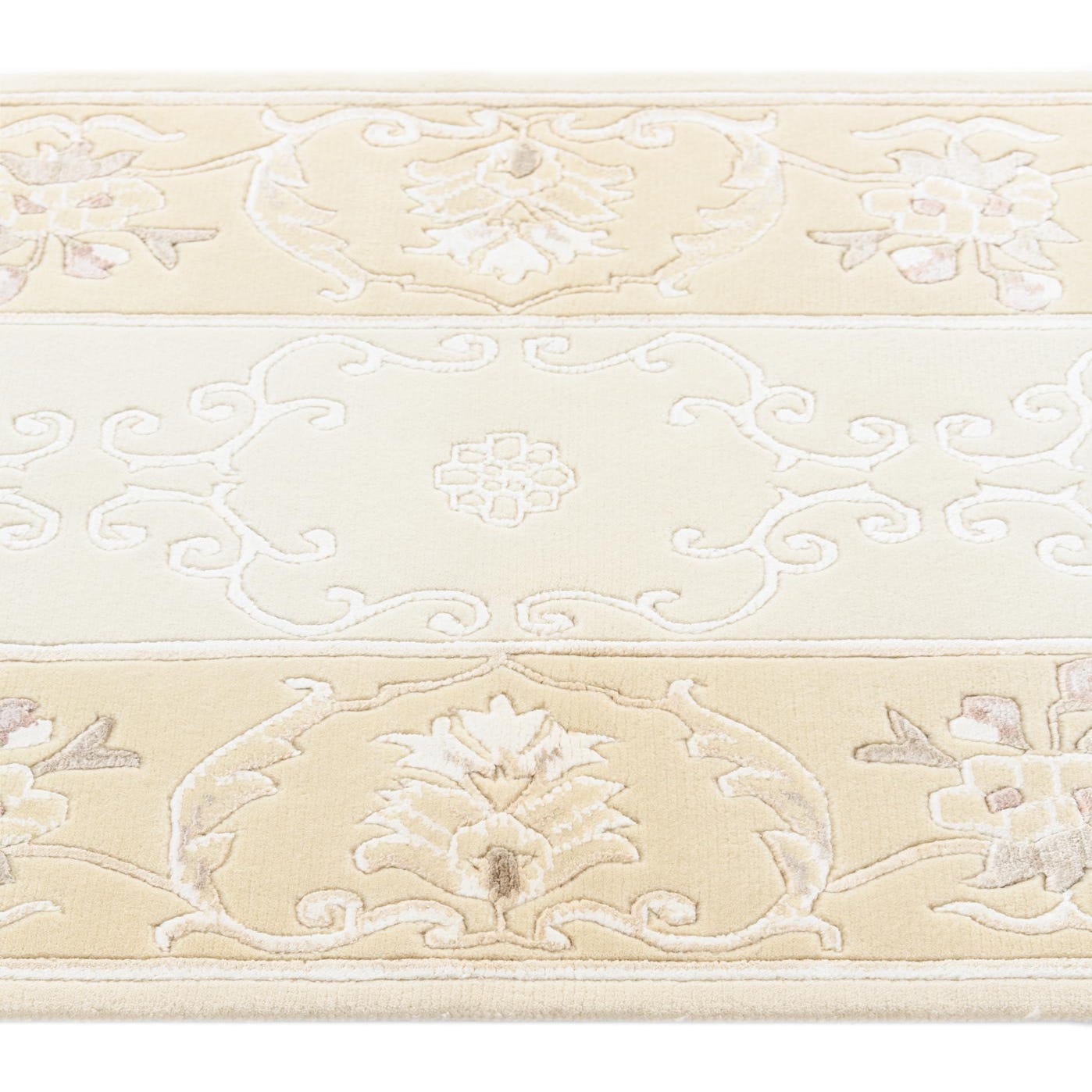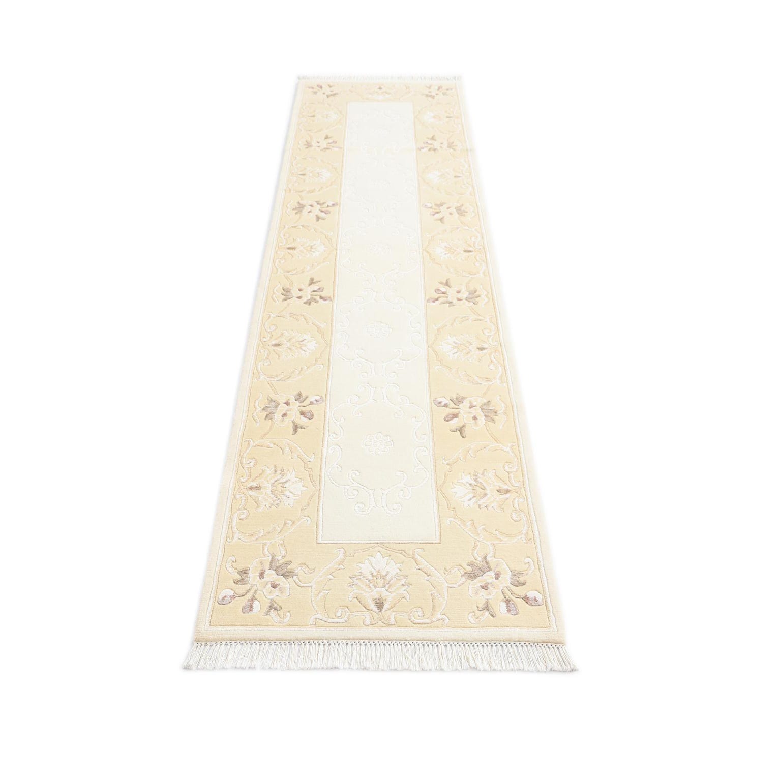 A Darya 10 Ft Runner rug in brown and ivory, featuring a central cream panel with subtle scrollwork and bordered by a tan floral pattern, suitable for a hallway.