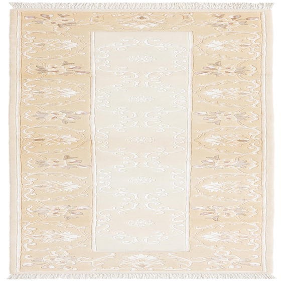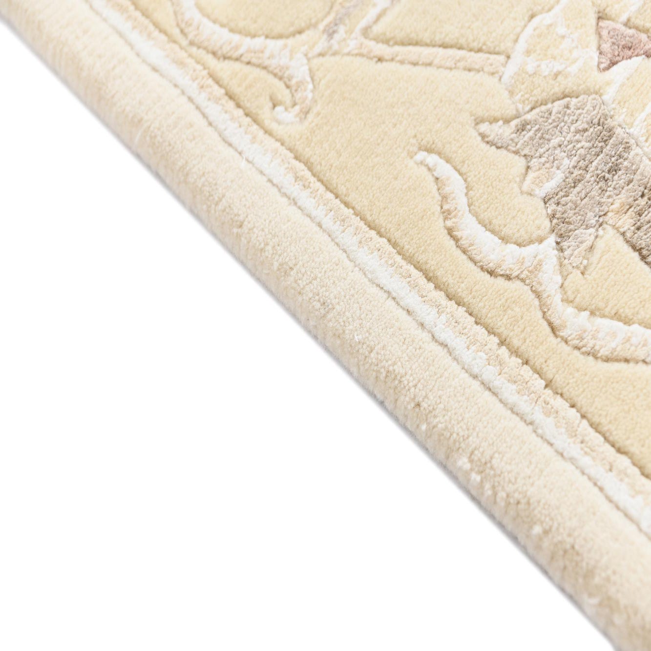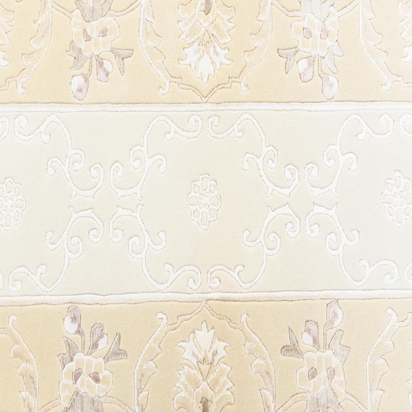 The rug, set against a Beige backdrop, showcases a traditional pattern with symmetrical floral and botanical motifs, showcasing an understated elegance. The intricate border encapsulates the central design, where each element is detailed with precision, providing depth and visual interest.