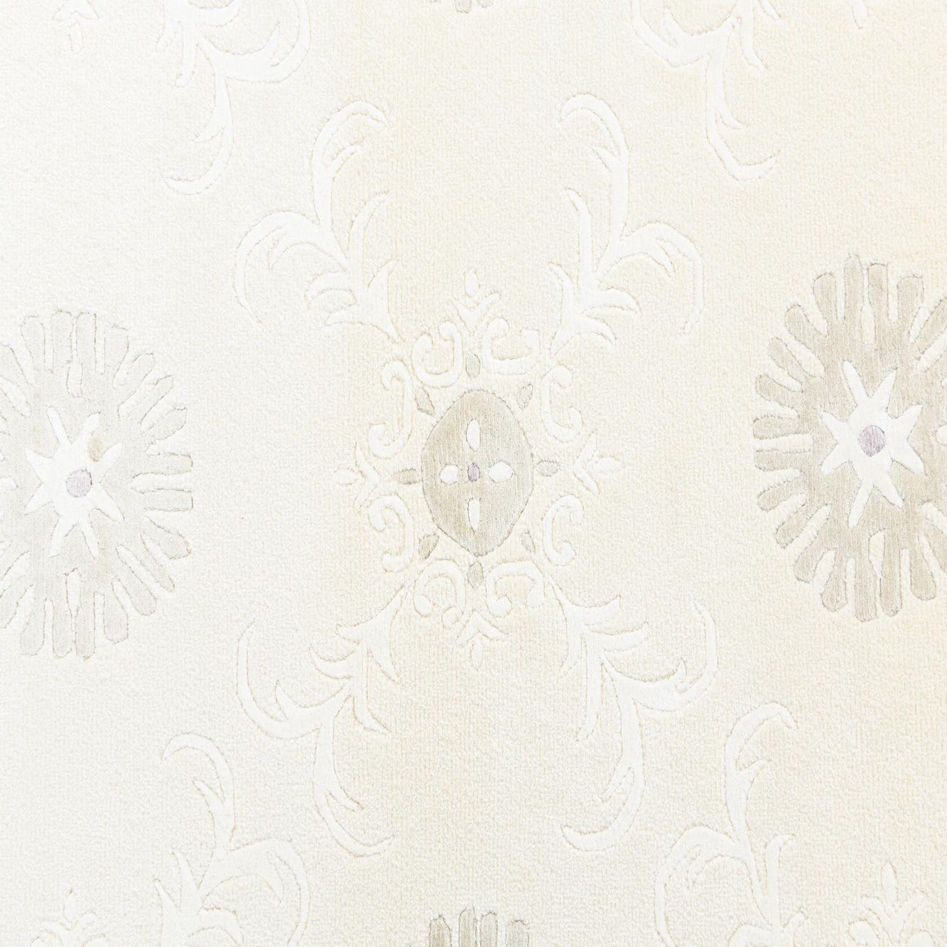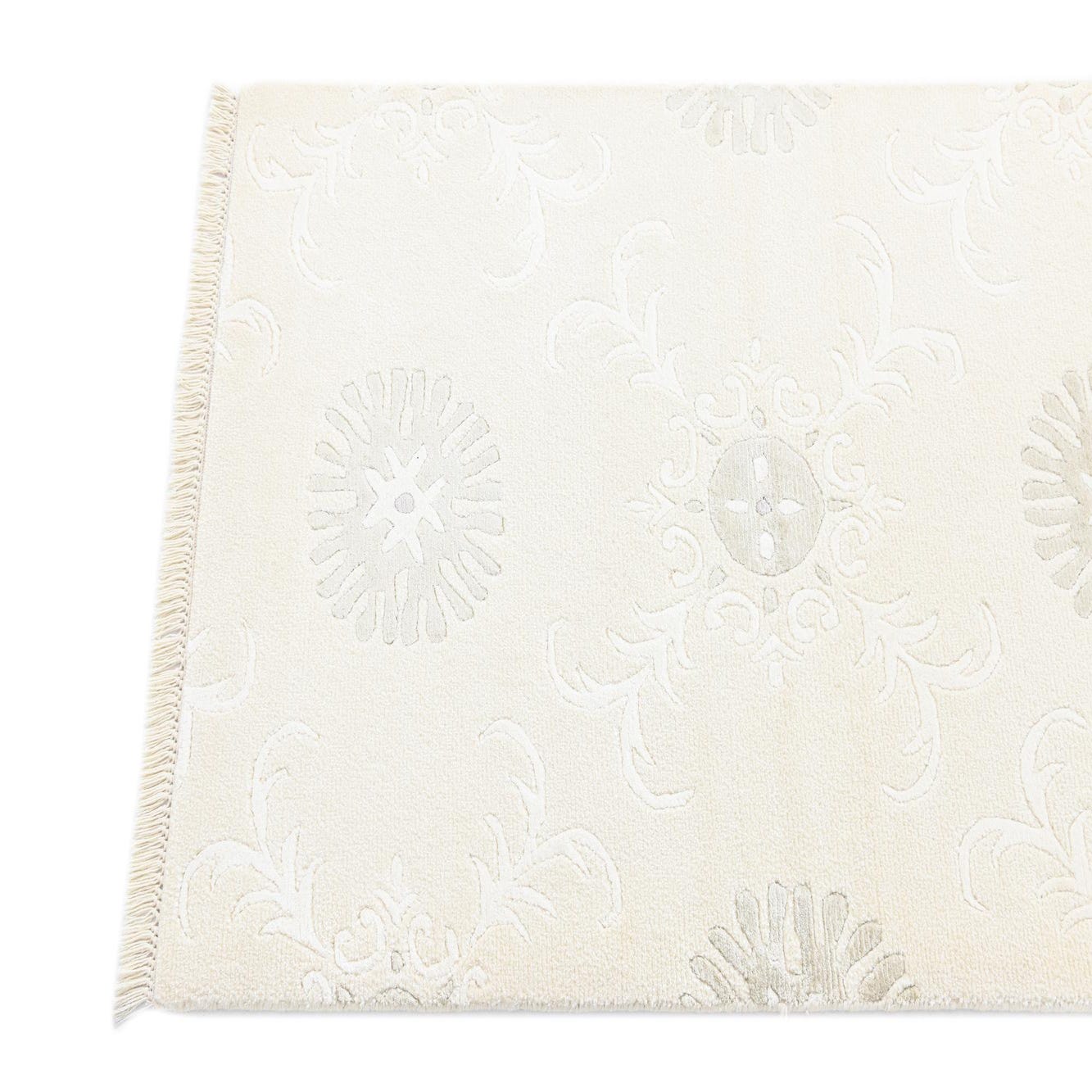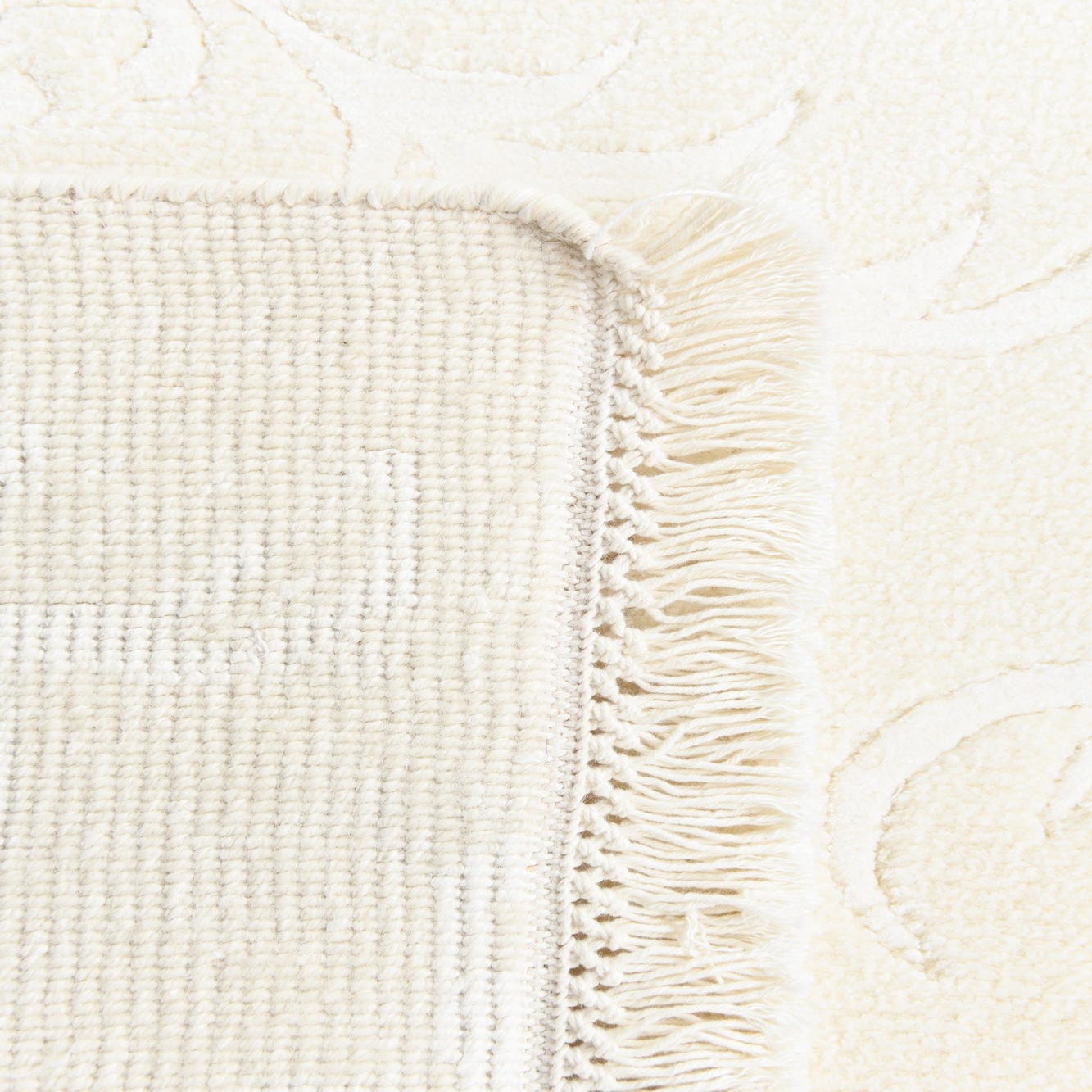 A soft beige ground sets a calm, neutral stage for a repeating medallion and scrolling vine motif worked in ivory with touches of olive. Hand-knotted in 100% wool, the rug shows a low-relief, carved effect where the medallions and arabesques rise slightly above the background, creating gentle shadows and a tactile contrast between cut pile and lower looped areas. The natural wool surface feels warm and slightly springy underfoot, and the knotted construction produces a refined, slightly lustrous finish with finished fringe on the ends.