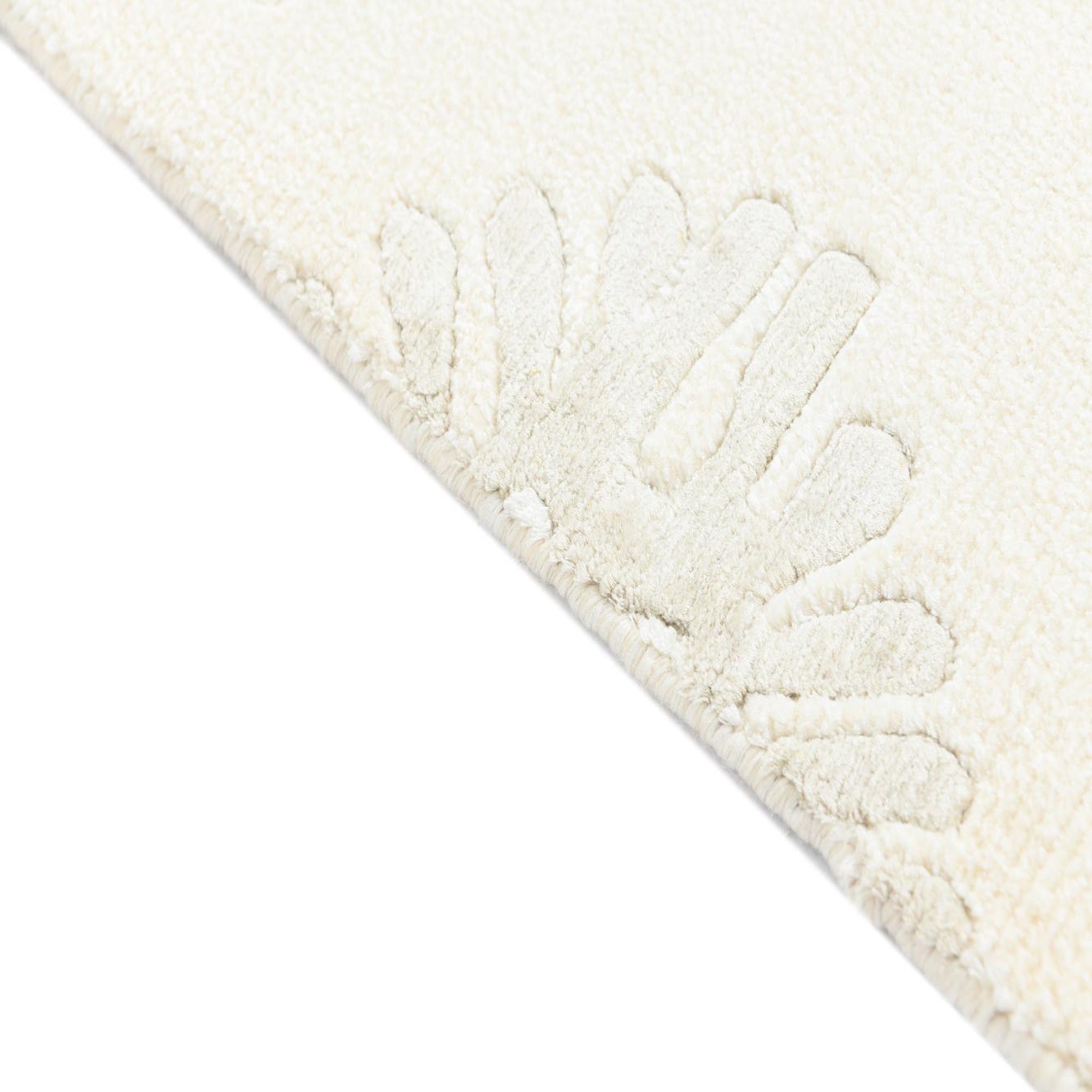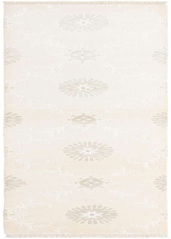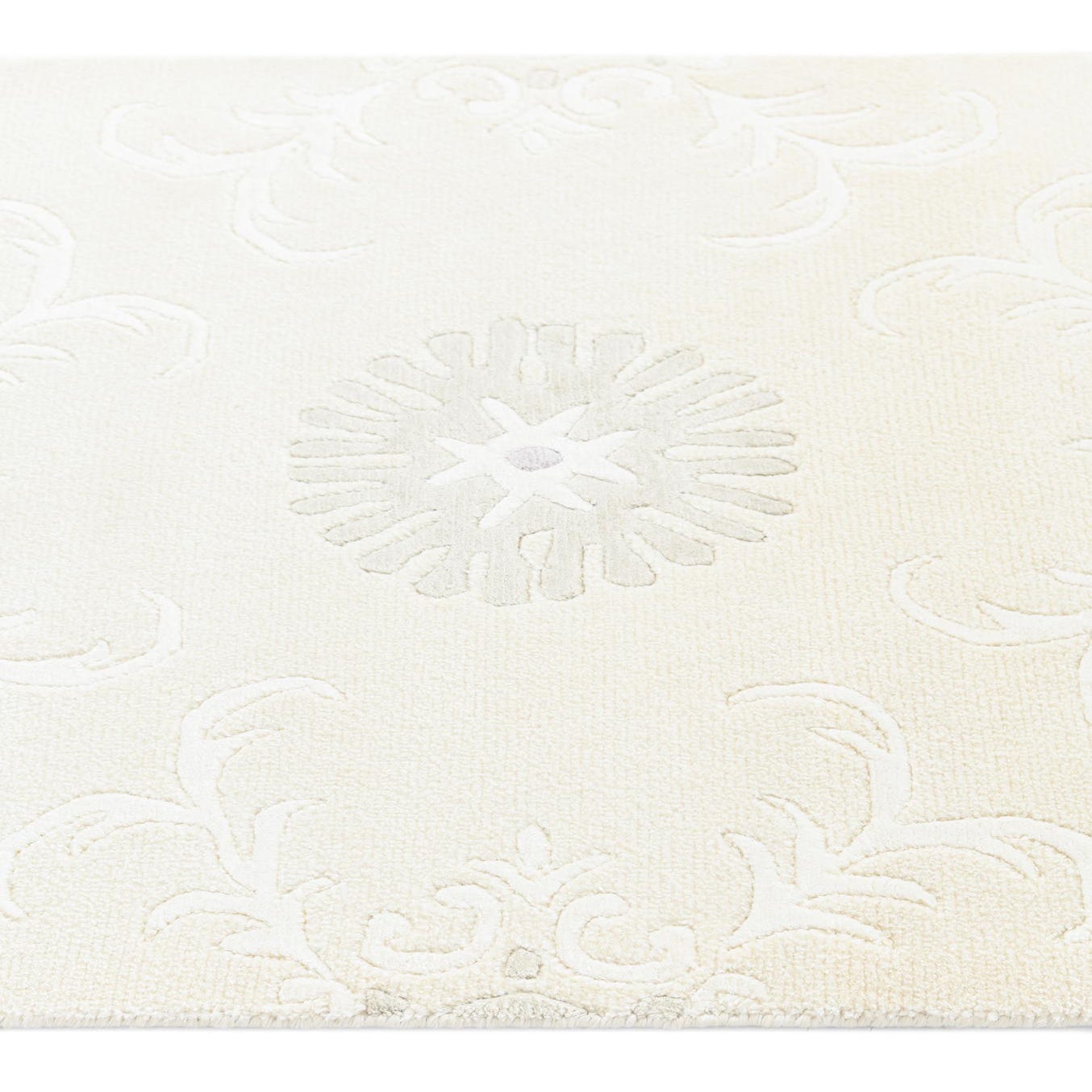 A soft beige ground sets a calm, neutral stage for a repeating medallion and scrolling vine motif worked in ivory with touches of olive. Hand-knotted in 100% wool, the rug shows a low-relief, carved effect where the medallions and arabesques rise slightly above the background, creating gentle shadows and a tactile contrast between cut pile and lower looped areas. The natural wool surface feels warm and slightly springy underfoot, and the knotted construction produces a refined, slightly lustrous finish with finished fringe on the ends.
