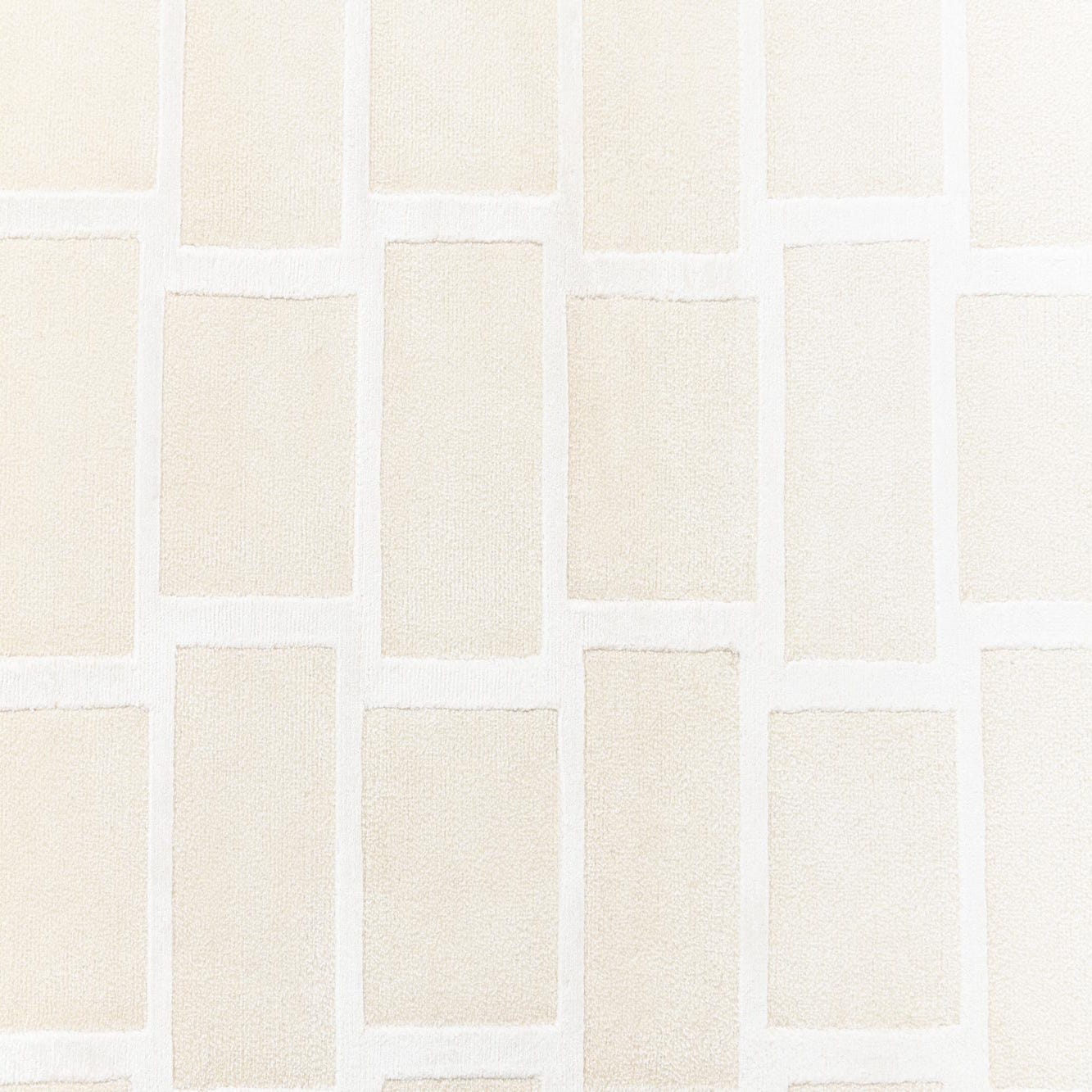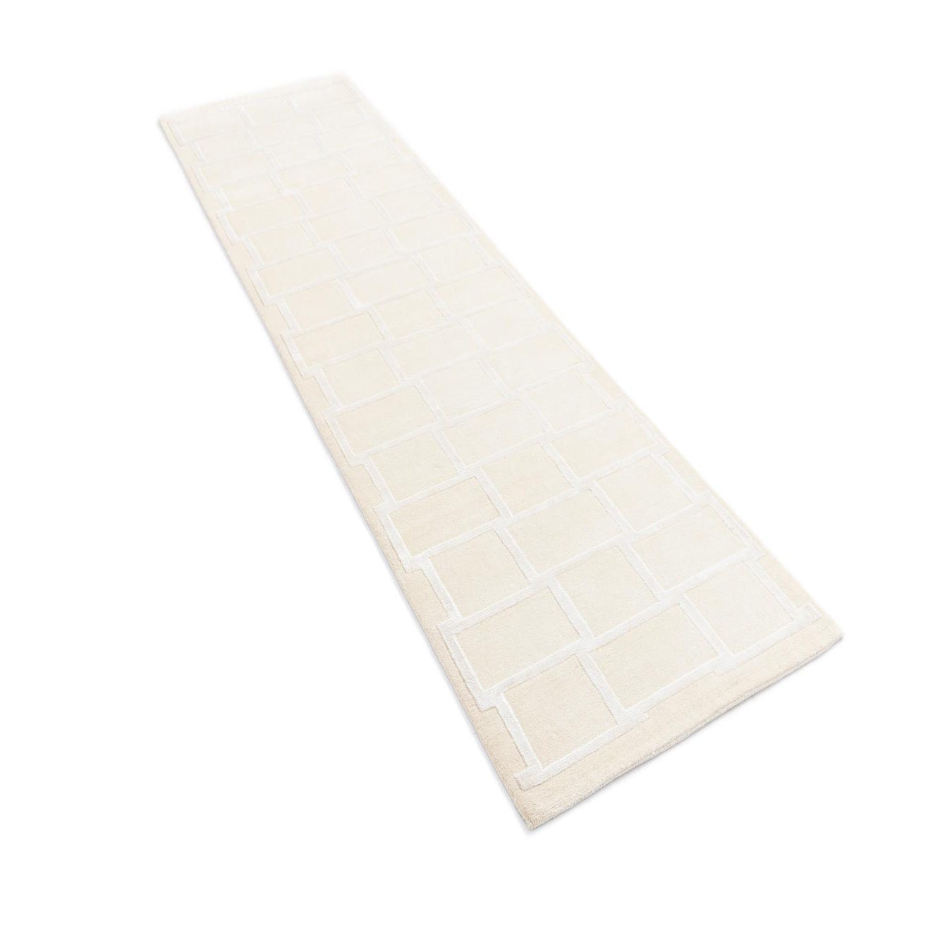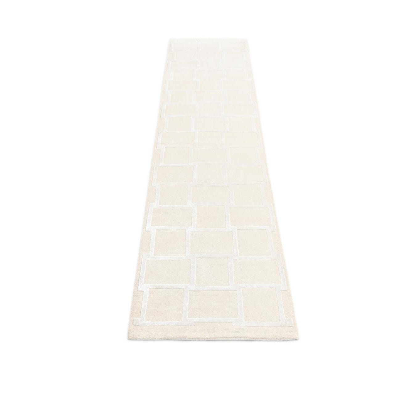 The Darya collection presents a 10 Ft runner hand-knotted from 100% wool, offering a durable yet soft texture underfoot. This particular piece showcases a modern geometric pattern, featuring a series of rectangles skilfully outlined to create a sense of dimension. The design utilizes a neutral palette with a beige background accented by ivory detailing, making it versatile for a variety of interior designs.