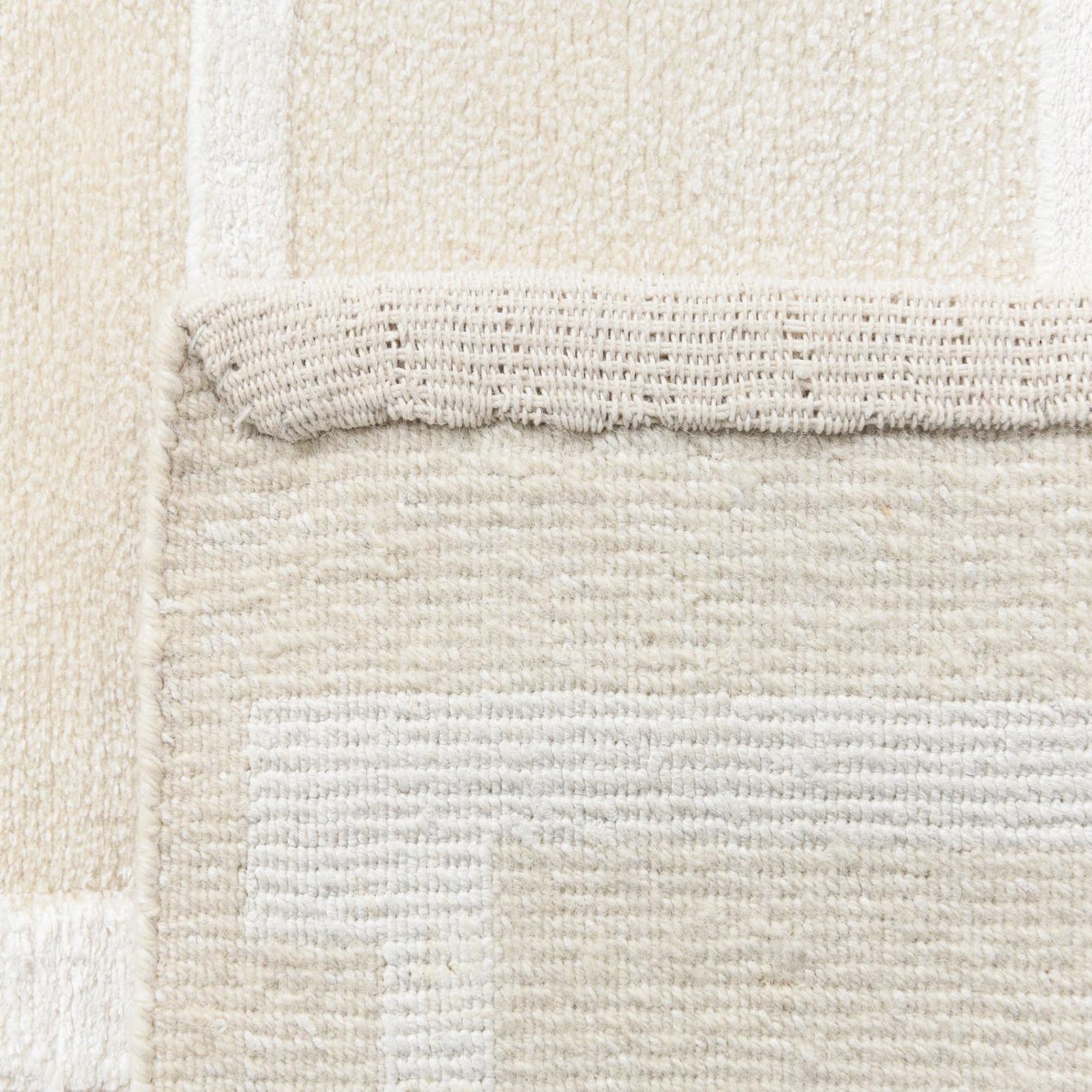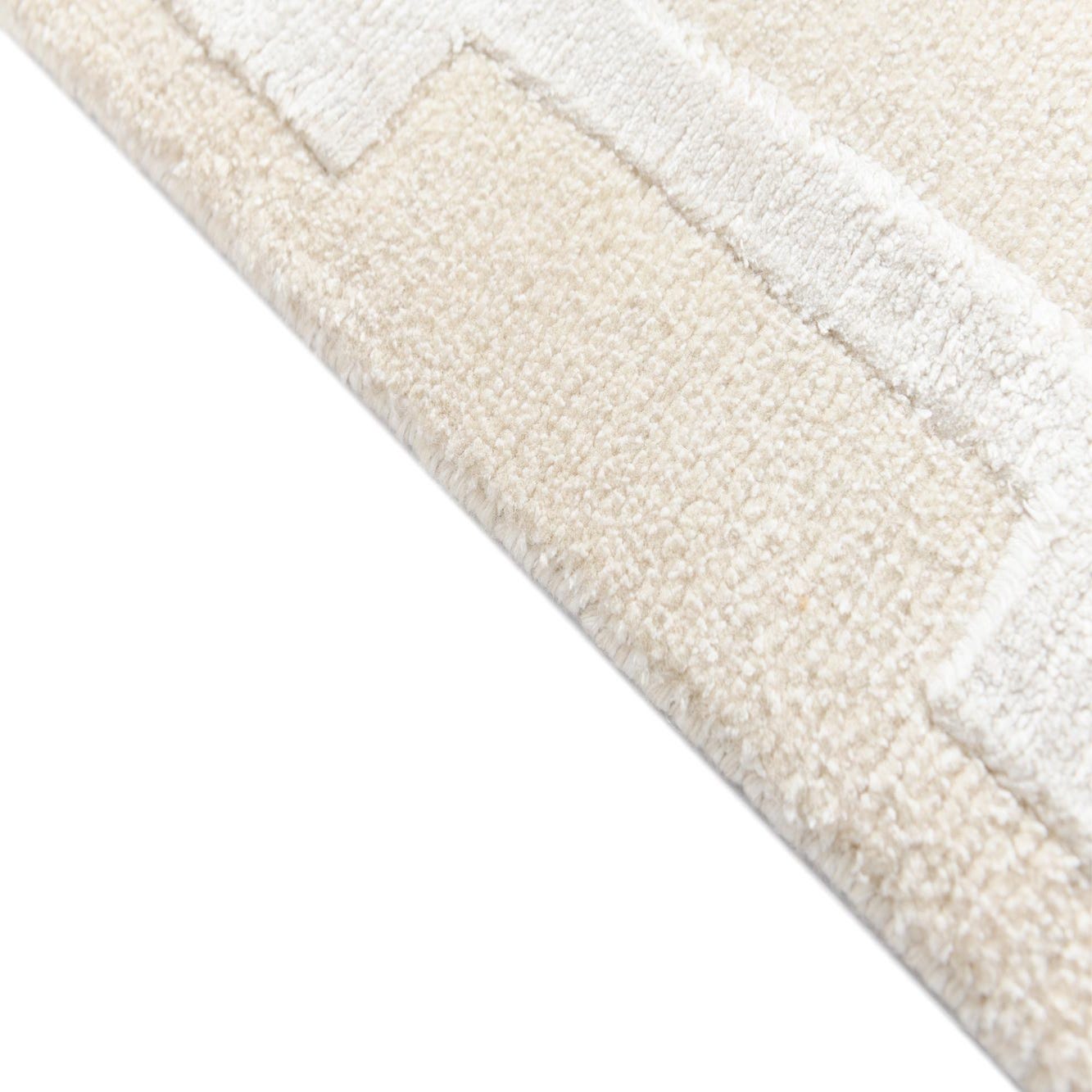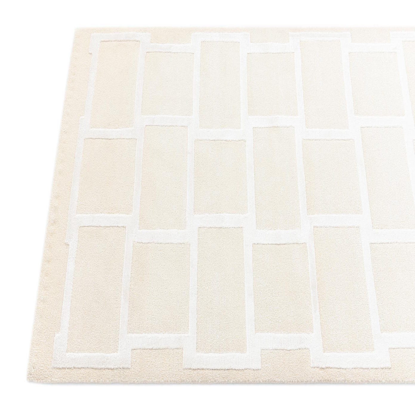 The Darya collection presents a 10 Ft runner hand-knotted from 100% wool, offering a durable yet soft texture underfoot. This particular piece showcases a modern geometric pattern, featuring a series of rectangles skilfully outlined to create a sense of dimension. The design utilizes a neutral palette with a beige background accented by ivory detailing, making it versatile for a variety of interior designs.