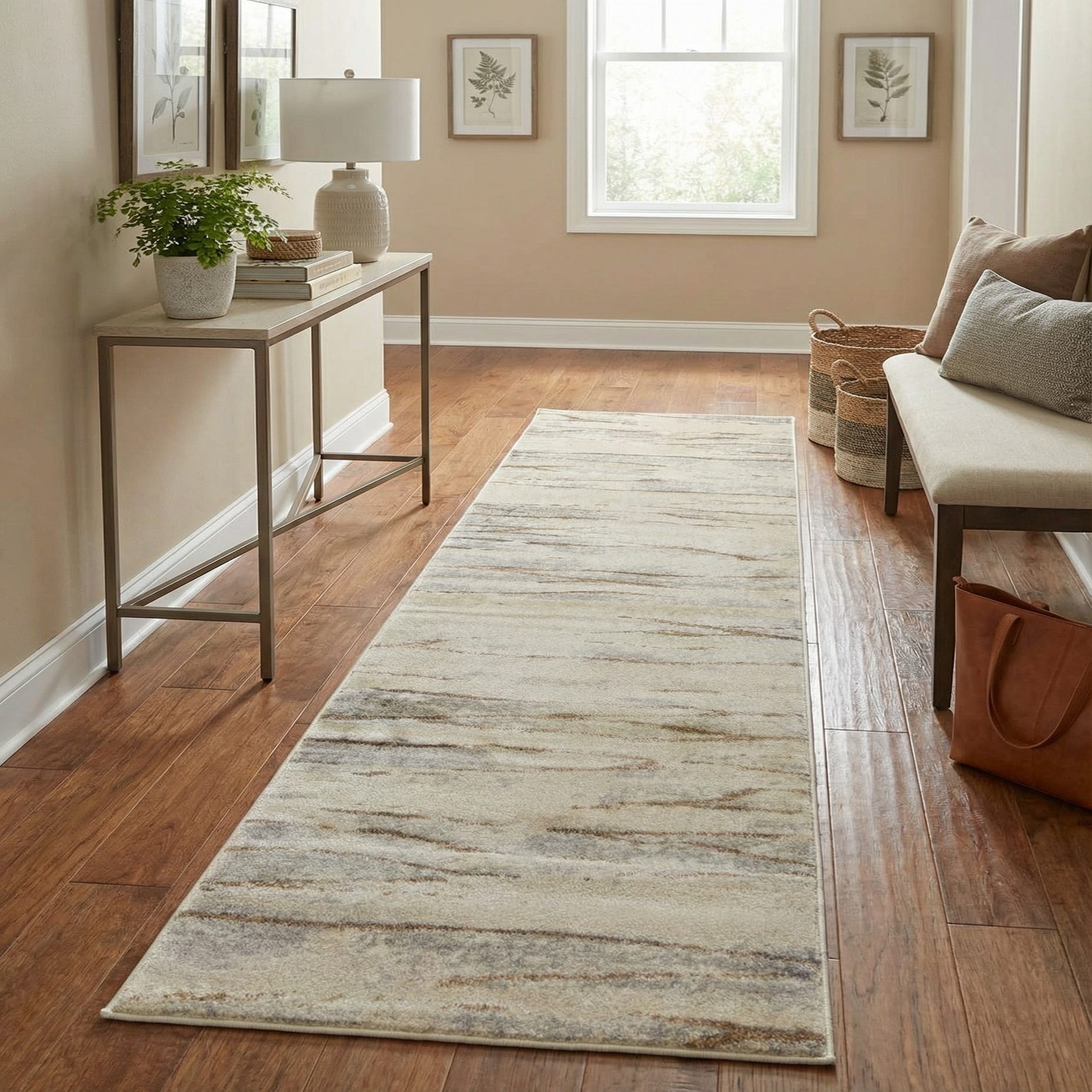 A soft beige field sets a calm, neutral stage for an abstract, striated pattern of light brown and gray brushstrokes that travel lengthwise across the runner. The design reads as natural, weathered linear veining—subtle shifts in tone create a sense of motion without overwhelming the space. Machine made from a 60% polypropylene and 40% polyester blend, the surface feels smooth underfoot with a gentle, low-profile softness and a slight sheen where the fibers catch the light.
