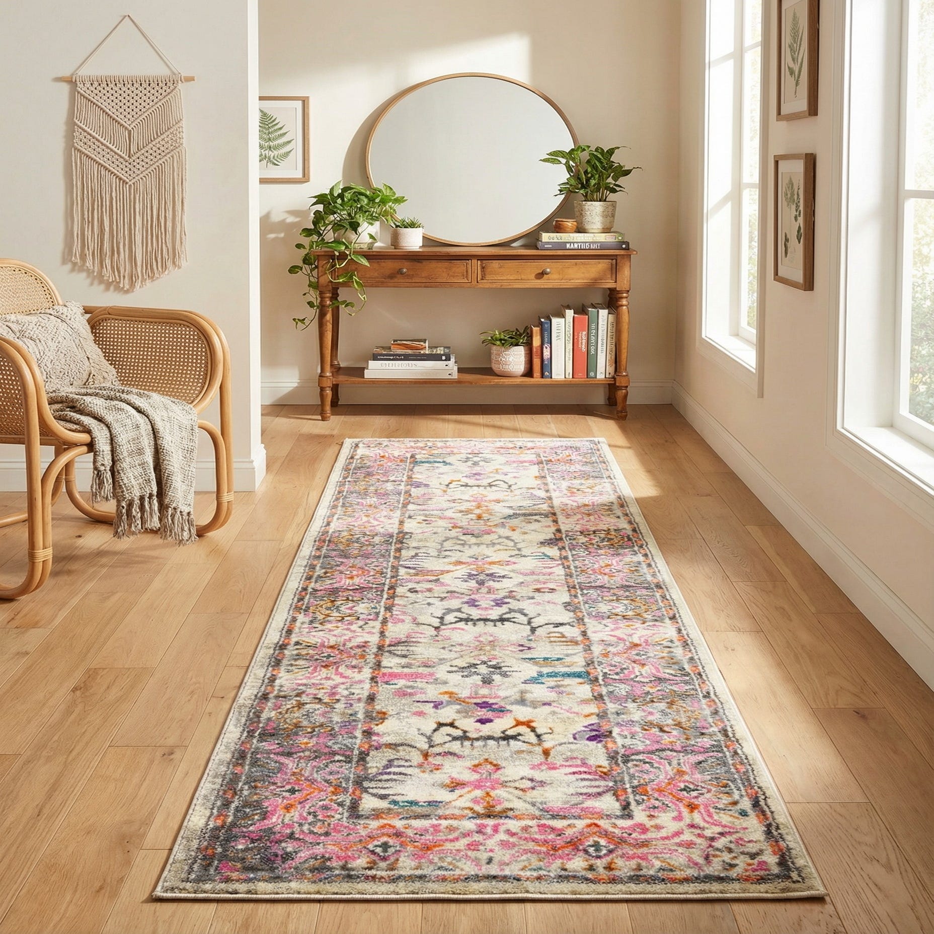 Machine made of 60% polypropylene and 40% polyester, the pile has a low-to-medium plushness that feels cushioned underfoot and shows subtle, slightly lustrous highlights where the polyester catches the light. This runner works well in a hallway or entry, along a kitchen aisle, or layered at the foot of a bed. Pair it with light-wood floors and neutral upholstery for a calm, contemporary look, or use it to add a soft, colorful counterpoint to modern farmhouse, bohemian, or eclectic interiors.
