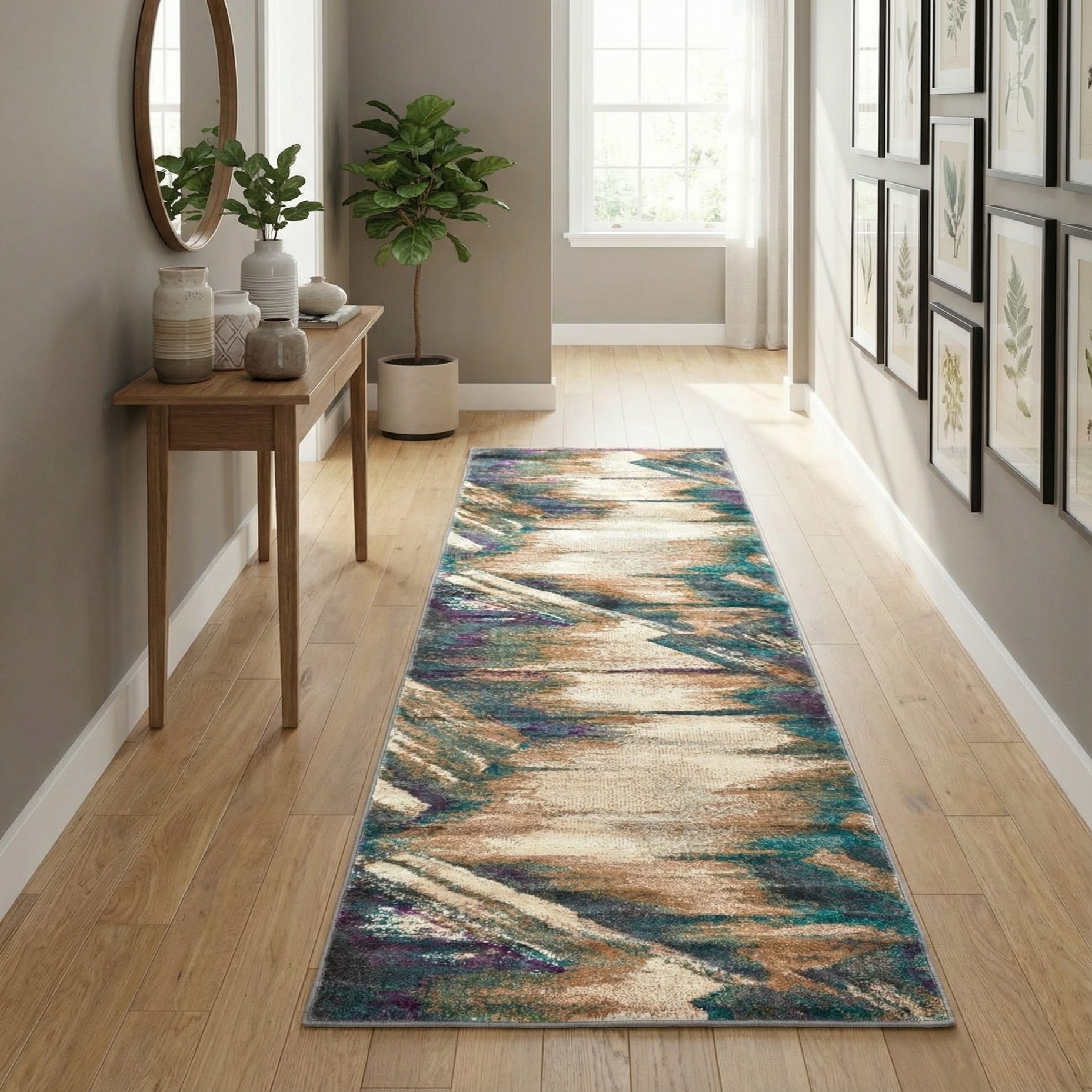 Machine-made in a 60% polypropylene / 40% polyester blend, this runner is designed for long, narrow spaces where color and pattern can lead the eye—ideal for hallways, entryways, kitchen aisles or the space beside a bed. It pairs well with warm wood floors and neutral furniture, and also complements eclectic or contemporary schemes that use teal or violet accents. Layer it under a console table or let it run the length of a corridor to introduce color and a soft walking surface.