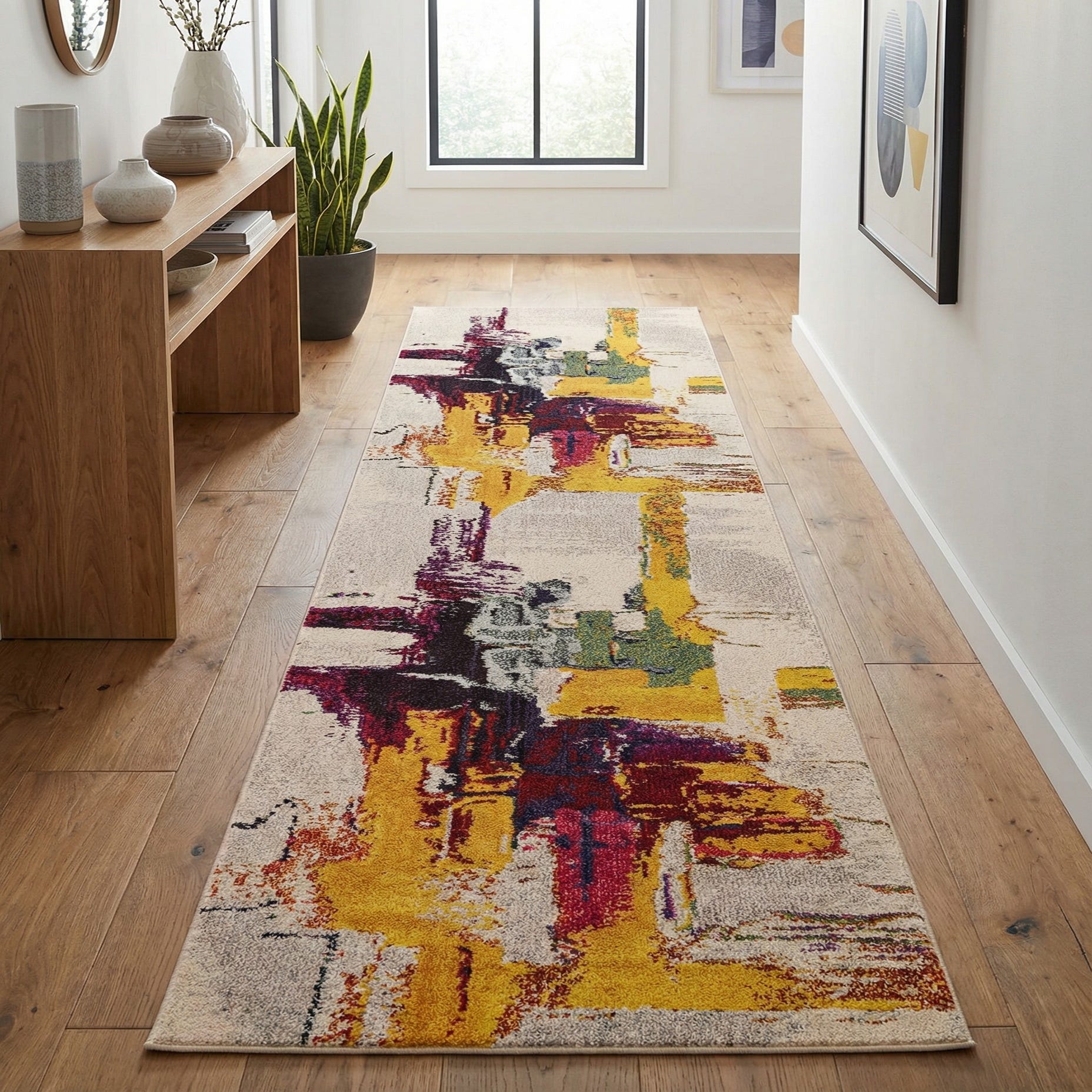 Machine-made from 100% polypropylene, this runner pairs a warm beige field with bold, painterly color blocks that give the surface a contemporary, abstract look. Sweeping strokes of yellow and orange form the visual anchors, while accents of violet, pink, purple, light blue and navy blue intermix in layered, distressed edges that suggest movement and depth. The pile has a pleasantly dense, slightly plush feel underfoot, with enough texture to catch light and highlight the layered colorwork without appearing overly raised.