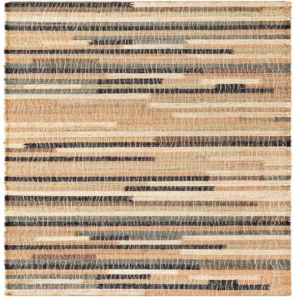 A staggered horizontal stripe pattern gives this hand woven cotton-and-jute runner a relaxed, geometric look. Bands and short bar motifs in black, ivory, muted green and warm brown sit against a beige ground, creating a layered, natural palette. The flatweave construction highlights the fibers’ texture: jute provides a slightly coarse, tactile surface while cotton adds softer accents and subtle variation in color and weave.