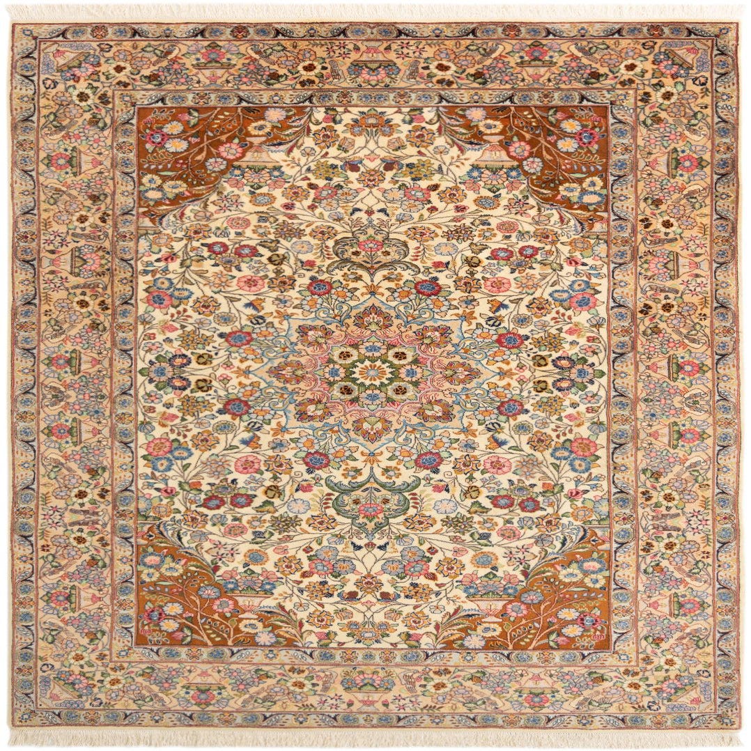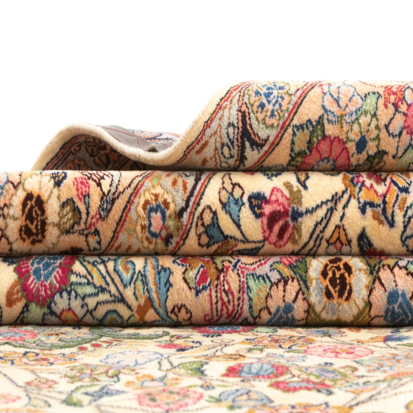 A 10 ft traditional Kashmar runner rug with a cream field, intricate floral patterns, and a brown border, ideal for a hallway.