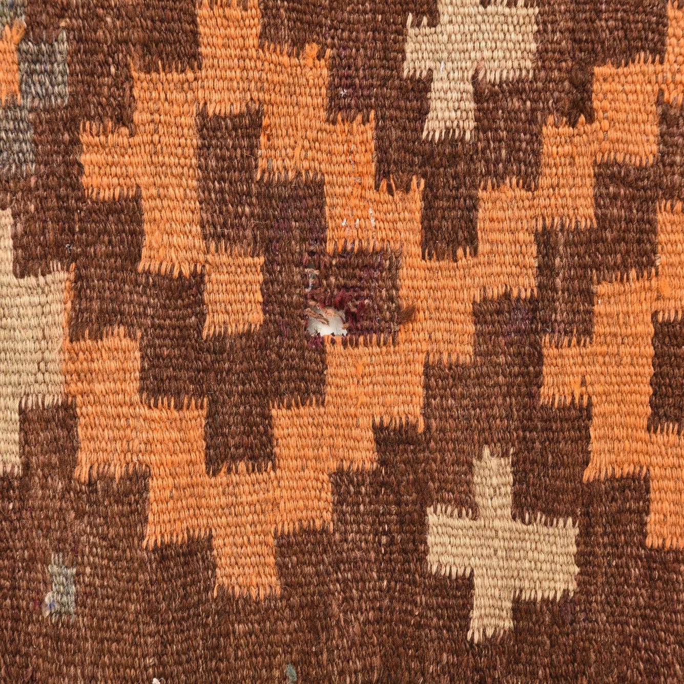 Despite its age, the runner exhibits signs of history and character through its missing fringe, a small spot of damage, and a hole, elements that underscore its authenticity and storied past.