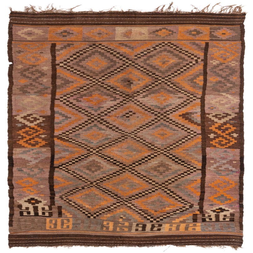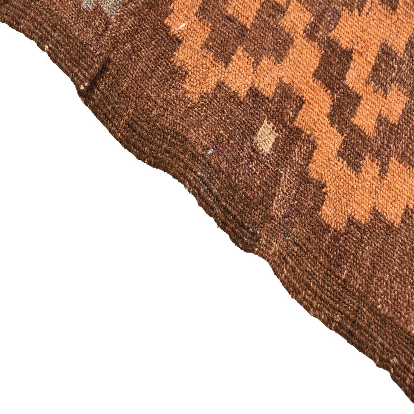 A 10 Ft Kilim Fars runner rug with a geometric diamond pattern in browns, tans, and ivories, suitable for a hallway.