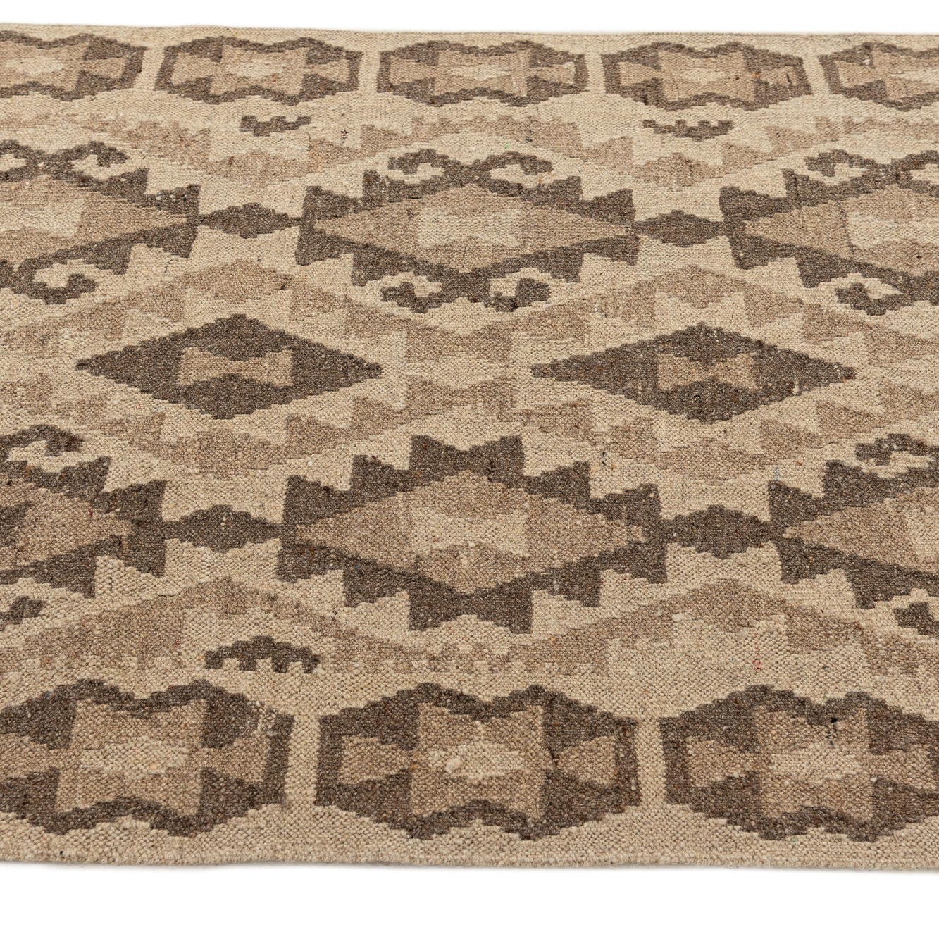 Hand-woven of 100% wool, this kilim-style runner presents a field of warm beige as its background with layered geometric medallions and stepped diamonds in rich brown and light brown tones. The repeating motif includes octagonal and diamond shapes framed by smaller angular elements, and a subtle border of repeating geometric forms runs along both edges. The low-profile, flat-woven construction has a tactile, slightly nubby wool texture that feels substantial underfoot while keeping a clean, tailored silhouette.