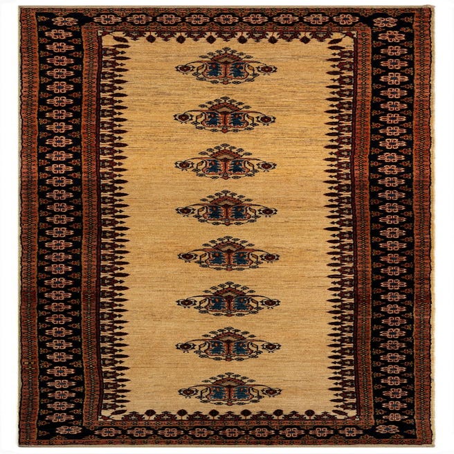A 10 ft runner rug in tan with a black and brown Persian border and central medallion patterns, ideal for a hallway.