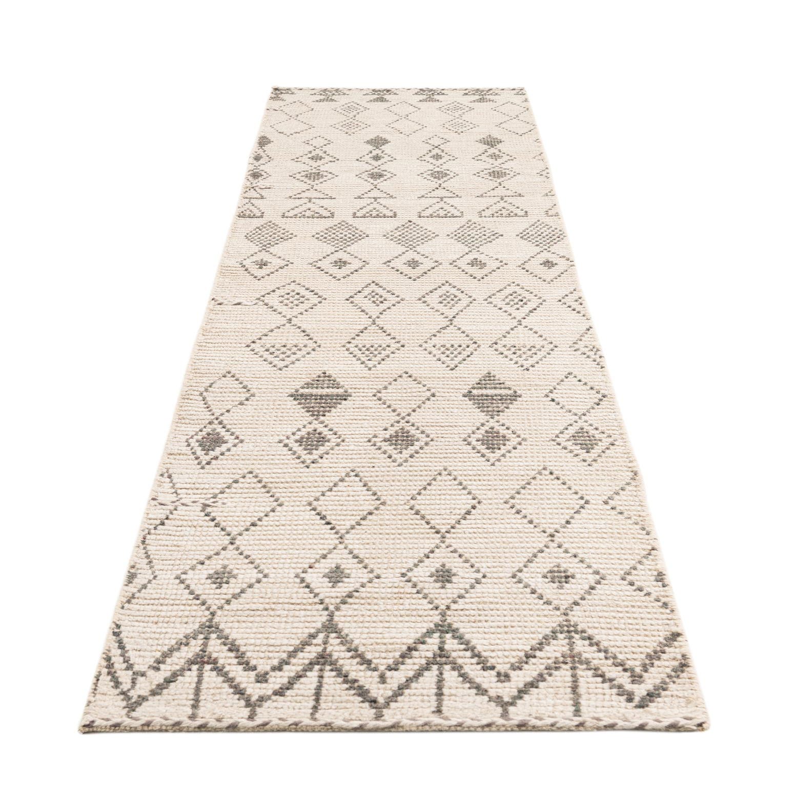 A 10 ft runner rug with a cream background and a repeating pattern of brown tribal diamonds and triangles.
