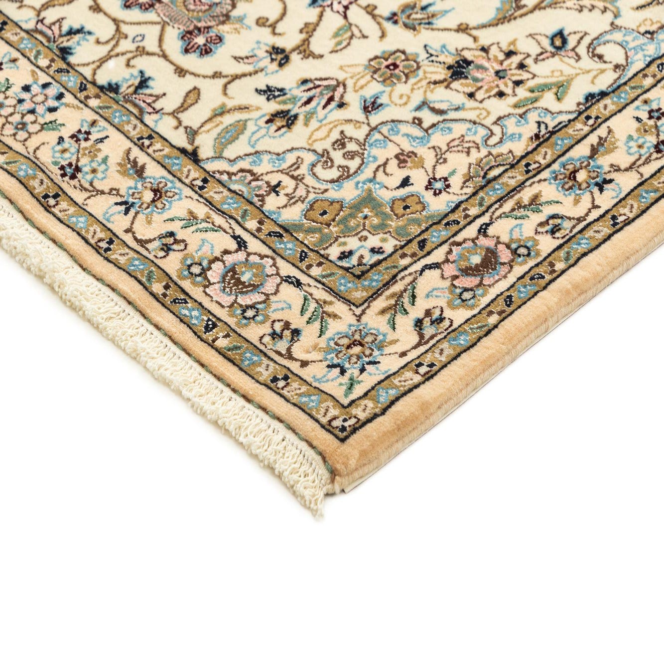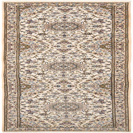 A 10 ft runner rug with a cream background and intricate traditional floral patterns in brown, tan, and light blue, ideal for a hallway.