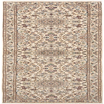 Hand-knotted in wool, this runner carries a traditional Persian-inspired layout with repeating medallions and an allover scrolling vine of floral motifs. The background is beige, which provides a warm, neutral field for the fine linework in soft blue, muted sage, warm rust and charcoal that outline each blossom and arabesque. A narrow inner and outer border frames the central pattern, and short fringes finish the ends. The dense, low pile of the hand-knotted wool feels firm yet yielding underfoot, with a subtle nap that invites touch and highlights the pattern’s fine detail.