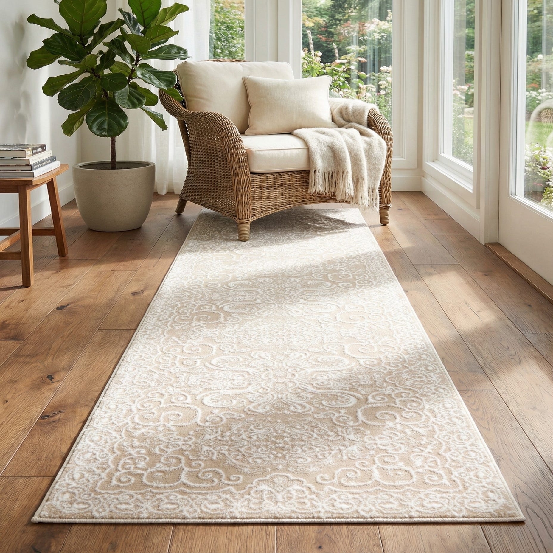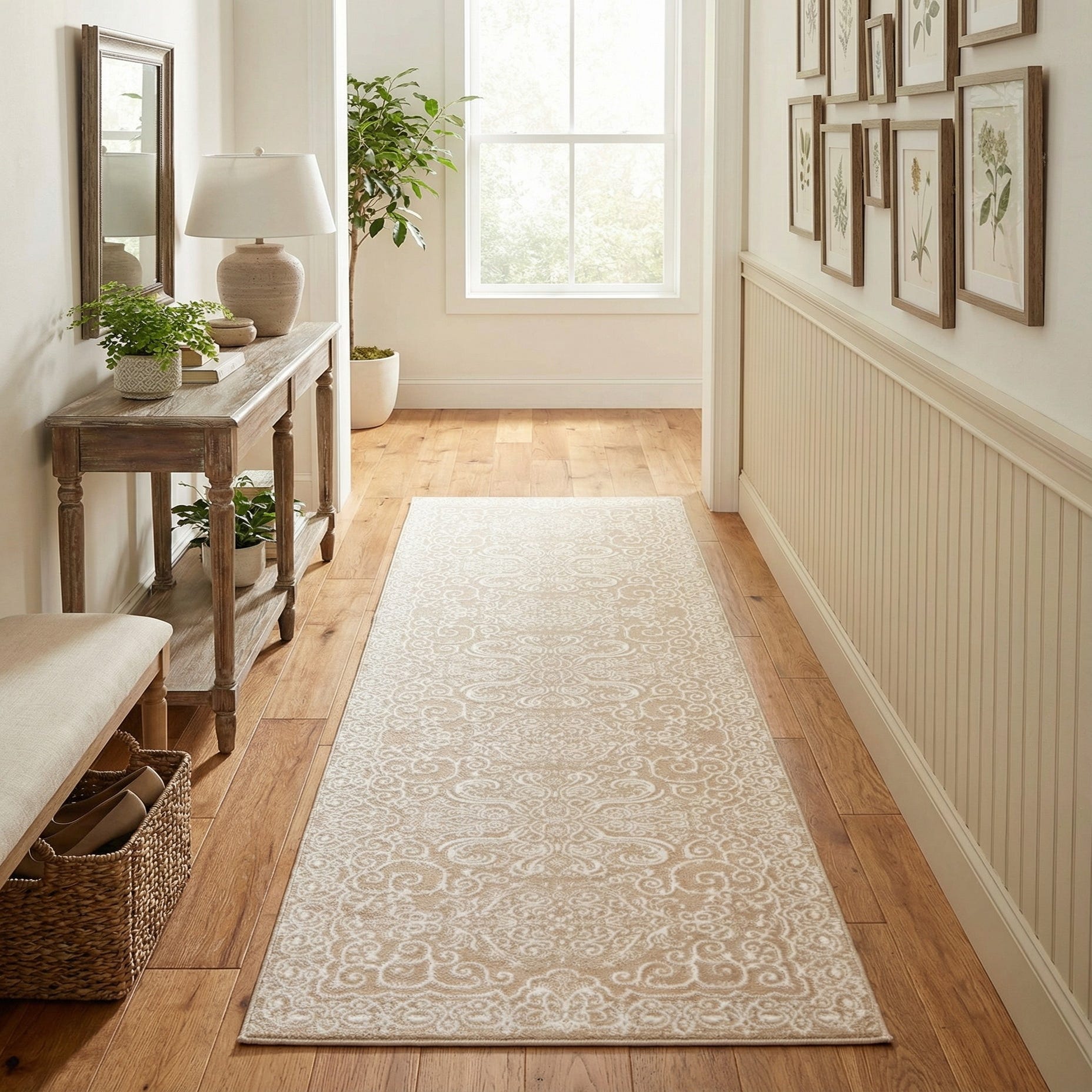 A 10 ft runner rug in shades of tan and cream, featuring an intricate traditional floral and scroll pattern, ideal for a hallway.