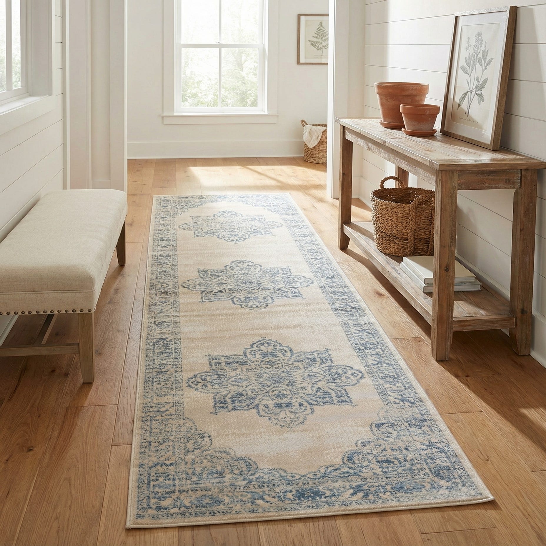 A 10 ft runner rug with a faded blue medallion pattern on an ivory background, featuring a traditional border.