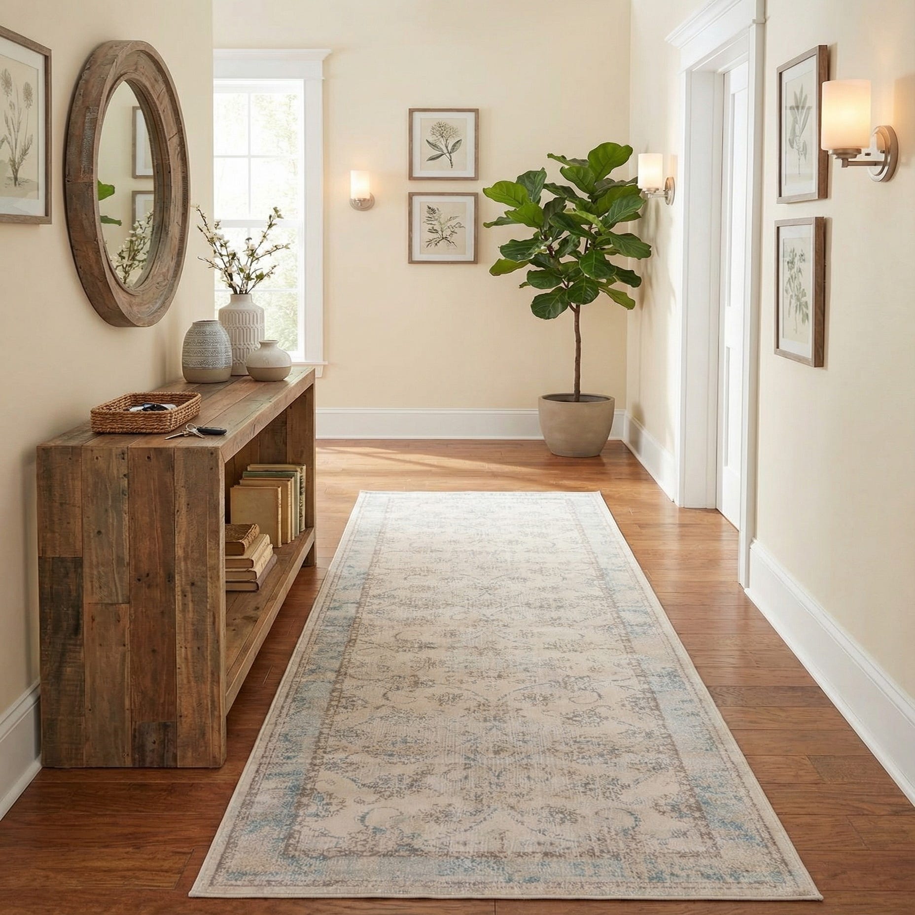 This runner works well in hallways and entryways where its neutral palette brightens circulation spaces, or placed alongside a bed to add quiet pattern and warmth. It pairs naturally with light woods, linen upholstery, and soft blues for a coastal or transitional look, and can also ground a modern farmhouse or traditional vignette when layered with textured throws and antique brass accents.