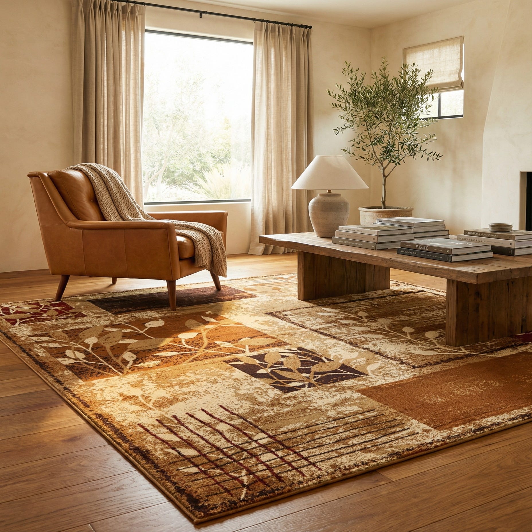 Machine-made from 100% polypropylene, the rug has a low-profile pile with a smooth, even hand that sits neatly beneath furniture and feels pleasant underfoot. Its color palette and pattern work well in a warm, casual living room or family room—anchor a seating area or place under a coffee table to add visual interest. It also complements wood-tone dining sets, leather sofas, or a home office with earth-toned accents, and can tie together a transitional space that mixes traditional motifs with modern furnishings.