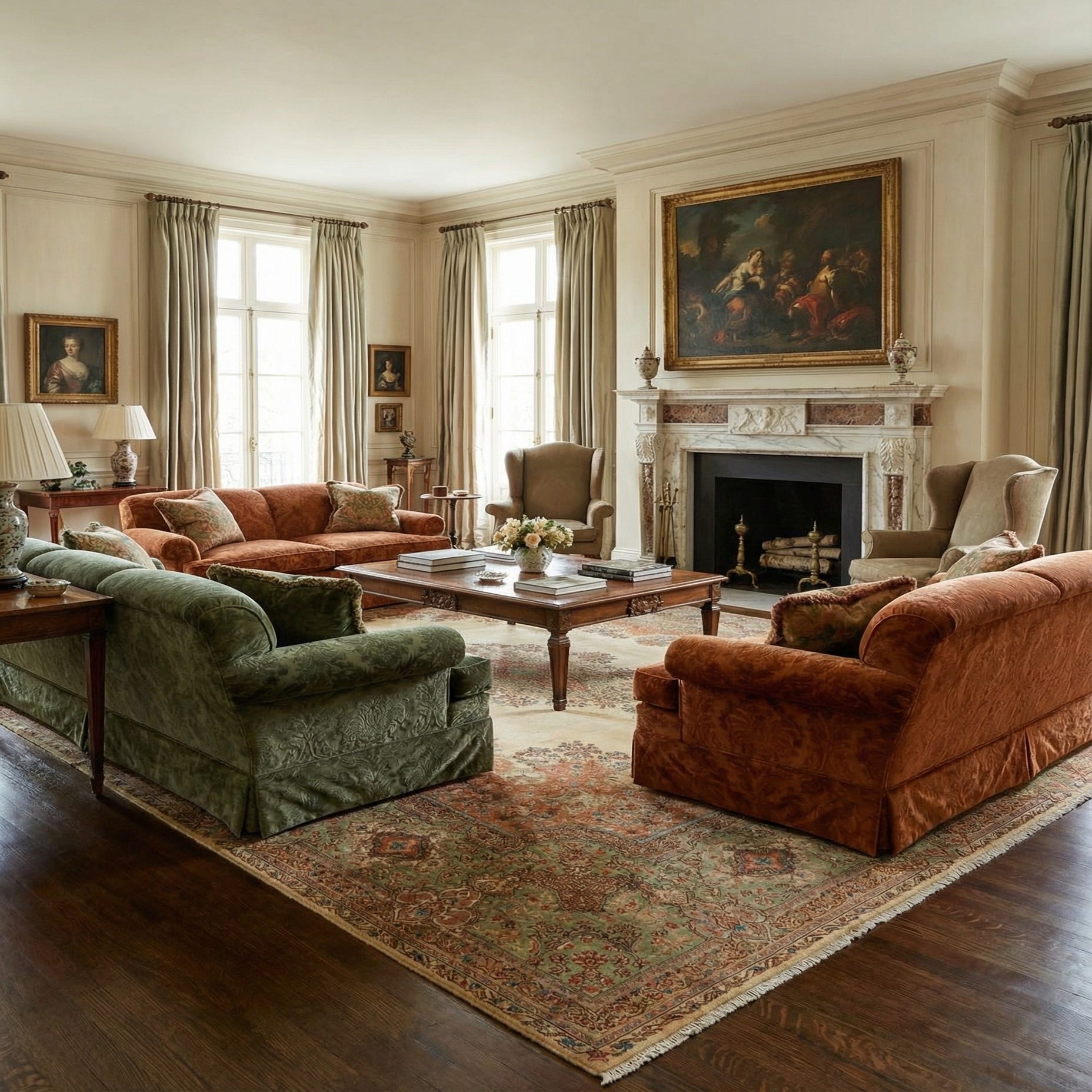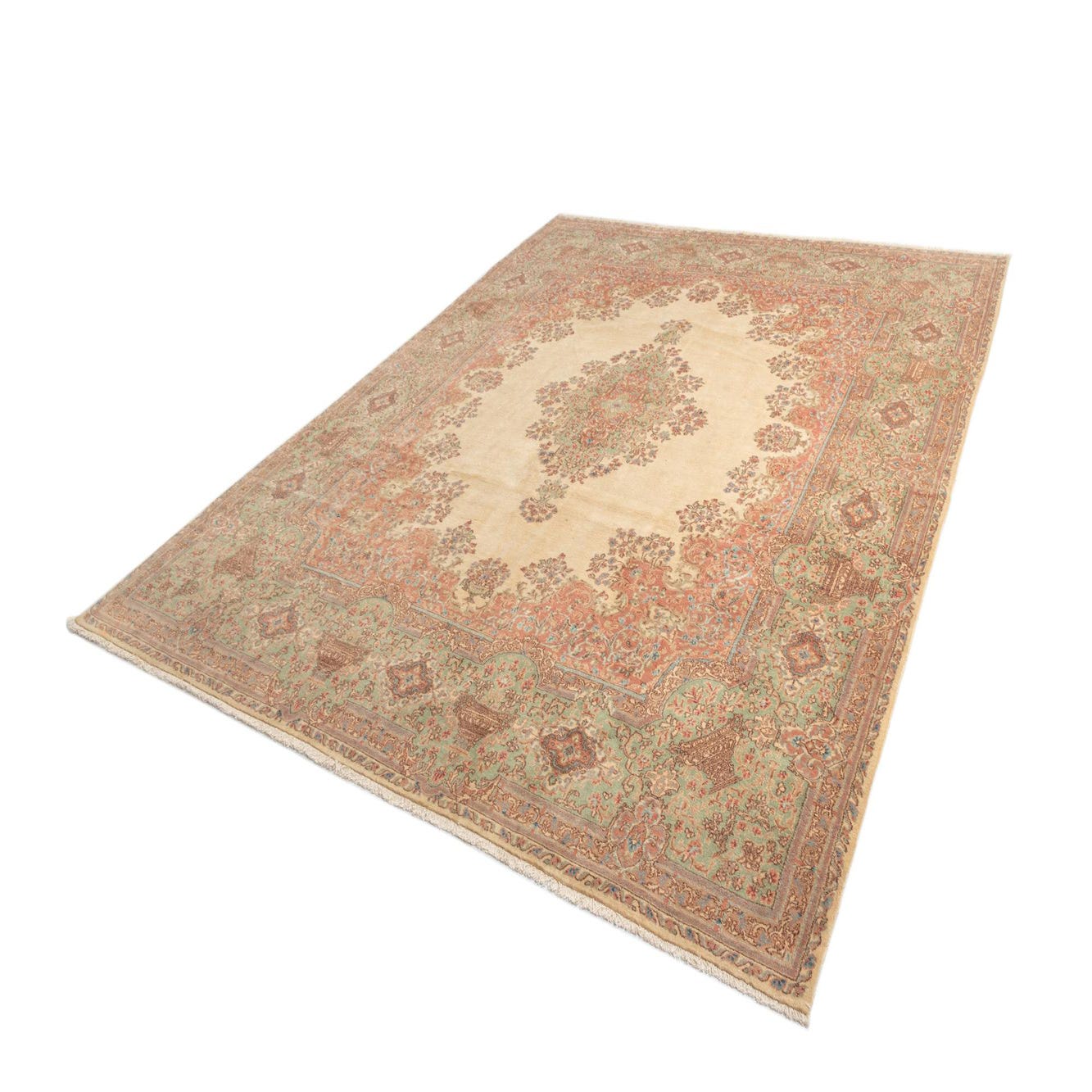 A 10x12 rectangular Persian rug with a cream center medallion, surrounded by intricate brown, tan, and ivory floral patterns.