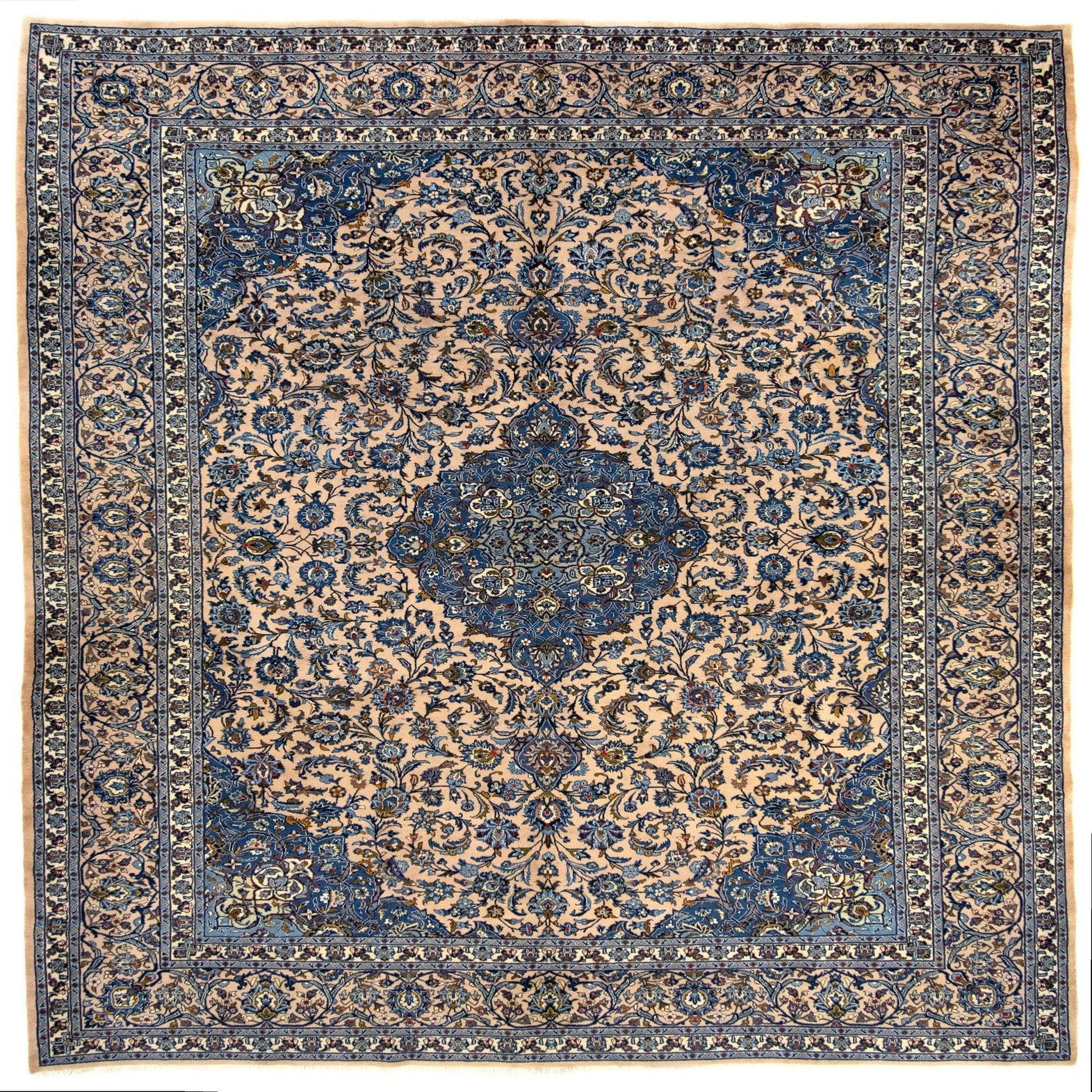 A 10x12 rectangular Mashad Persian rug with a cream and tan background, featuring intricate blue and brown floral patterns and a central medallion.