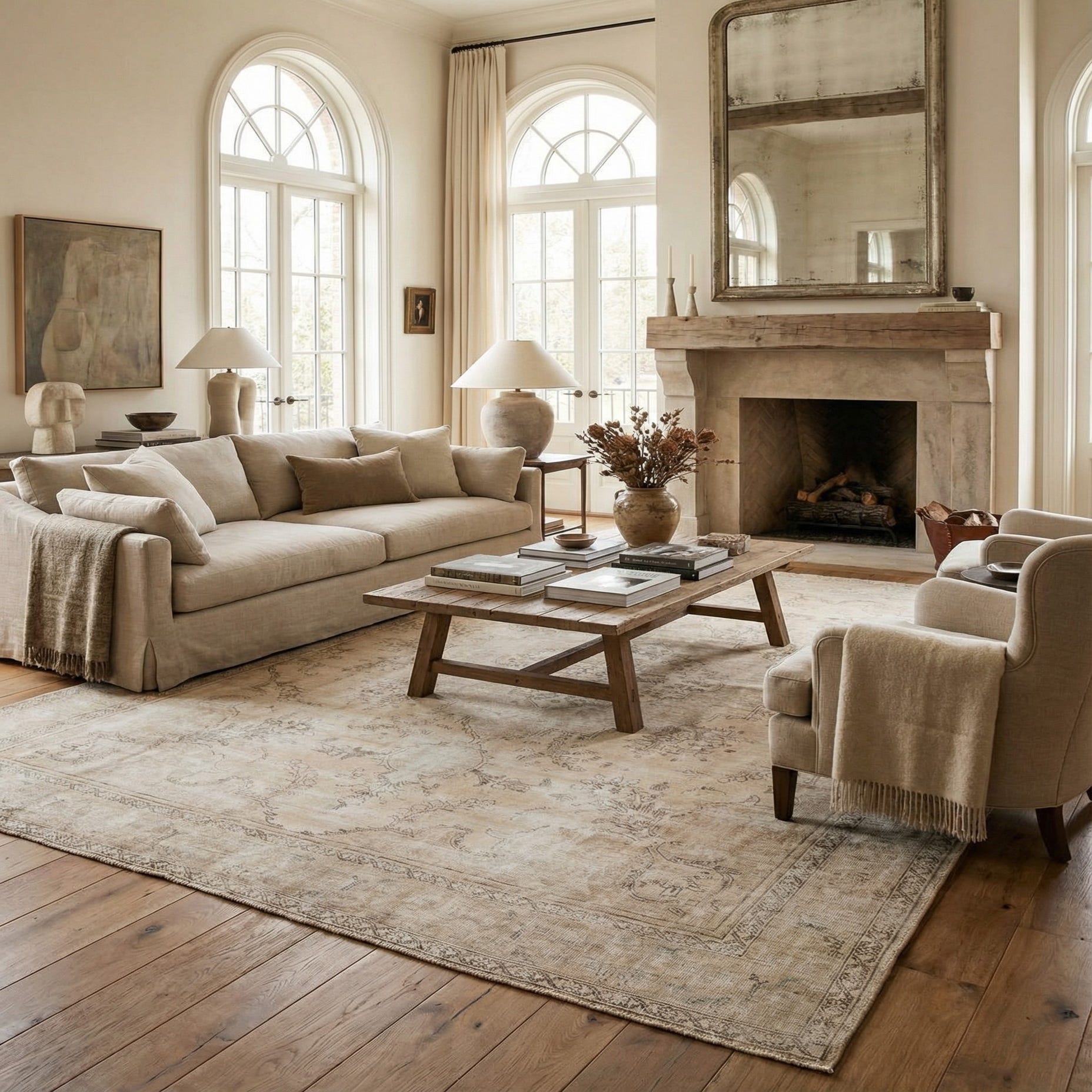 A 10x12 rectangular Ultra Vintage wool rug featuring a distressed Persian medallion pattern in muted browns, tans, and creams, suitable for an indoor living space.
