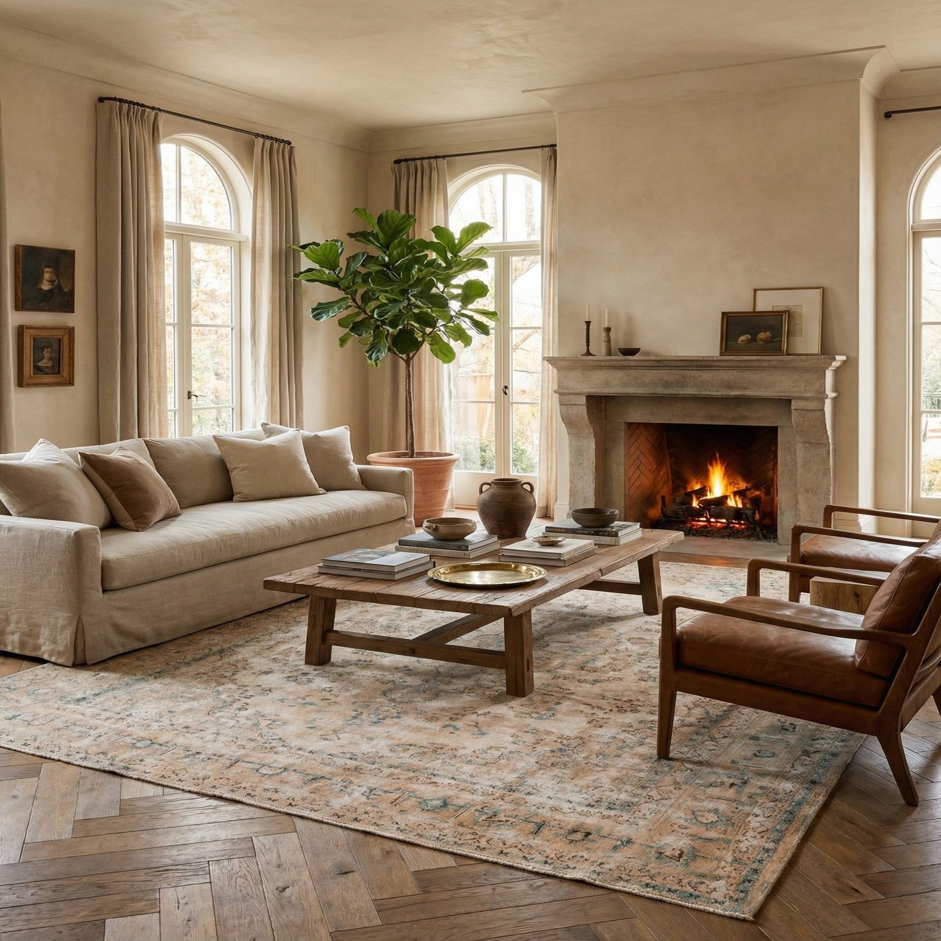 The rug's woolen texture ensures a natural, soft feel, and its large dimensions make it an excellent foundation for living rooms, dining areas, or large open spaces where it can serve as a unifying centerpiece. Its classic pattern harmonizes with an array of interior styles, including but not limited to, traditional, transitional, and modern eclectic decor. For a refined and cohesive look, this rug pairs well with furniture featuring natural wood tones, as well as with navy or beige color schemes that echo its inherent palette.