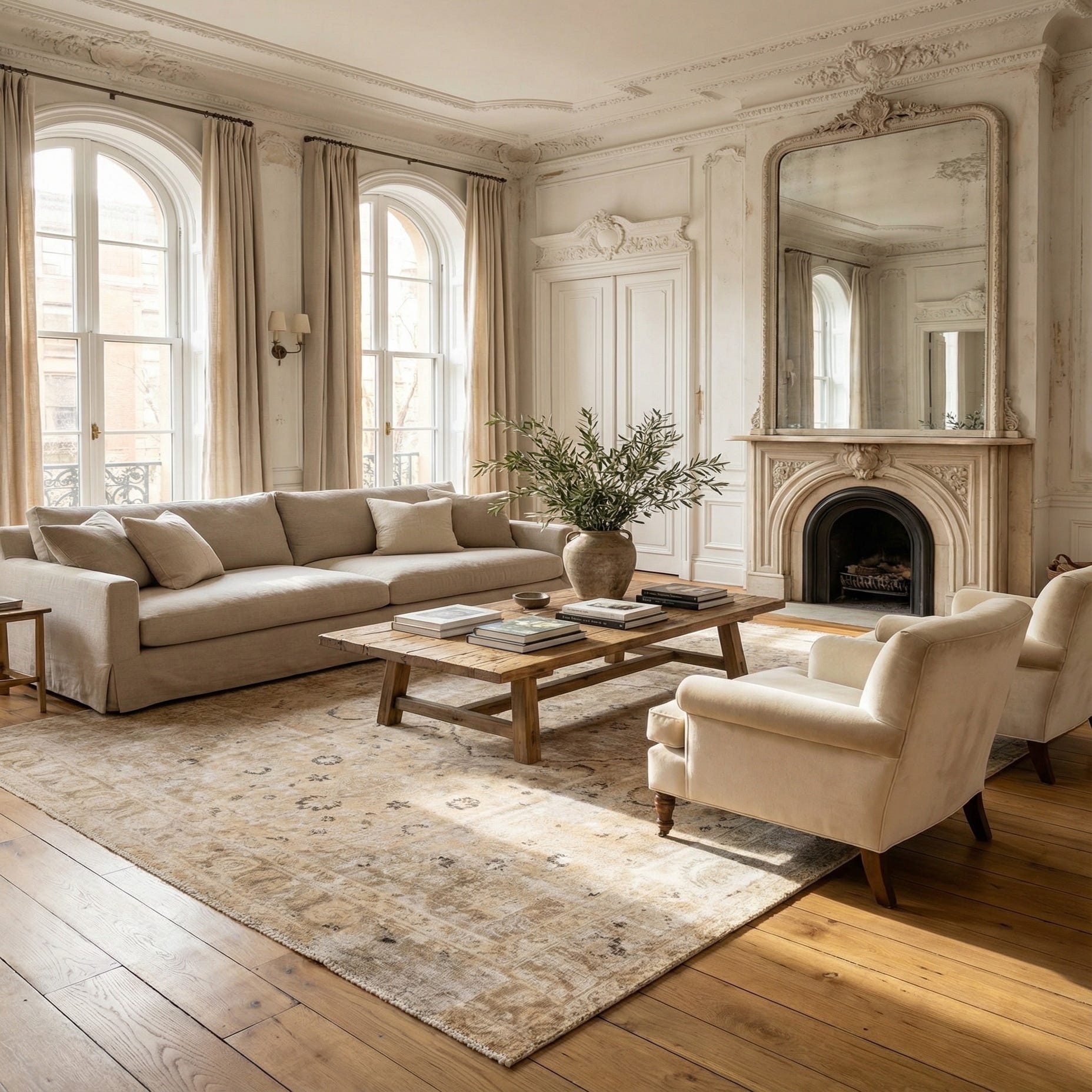 Due to its versatile color scheme and timeless design, this rug is extraordinarily adaptable. It would complement a traditional setting with rich wooden furnishings and classic décor, as well as provide an anchor to an eclectic interior that mixes old-world charm with modern minimalism. Similarly, in a contemporary setting with a neutral color palette, this rug could serve as a soft yet sophisticated focal point. Whether placed in a large living area, under a grand dining table, or in an open-concept space, it will add a layer of warmth and refined style.