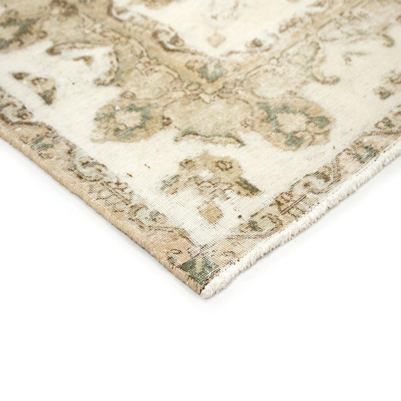 The Vintage Royal collection presents a hand-knotted rug of 100% wool, showcasing a sophisticated array of beige, brown, cream, and green tones. The background color is chiefly beige, providing a neutral canvas that allows the intricately patterned design to stand out. Its central medallion motif is flanked by intricate border designs, which incorporate floral patterns and scrollwork that contribute to the rug's overall classic charm.