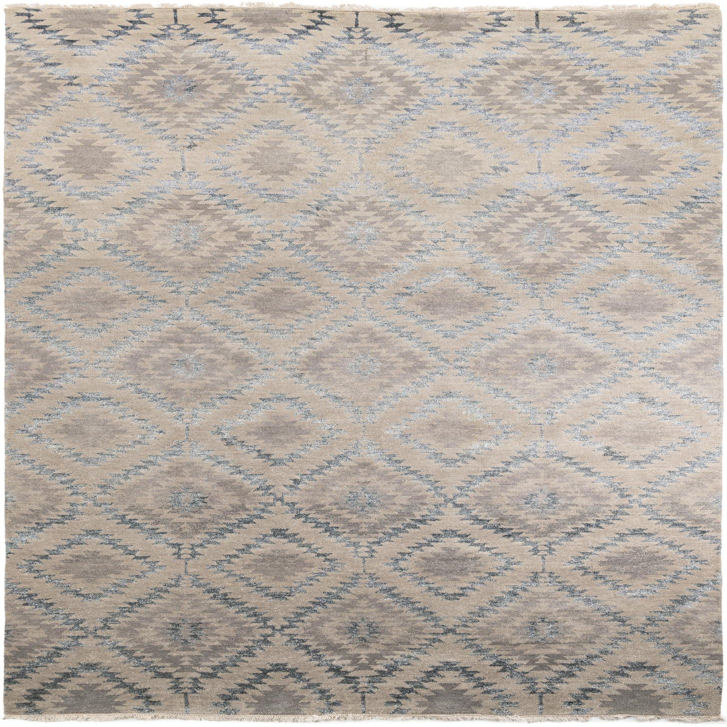 Primary color is Beige. Colors in this rug include: Beige, Blue, Gray.