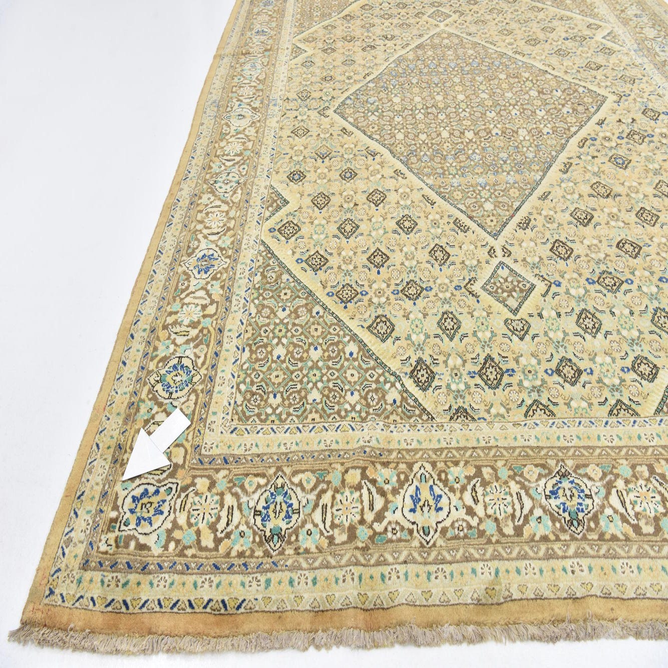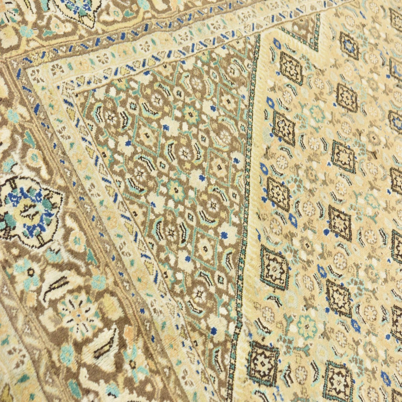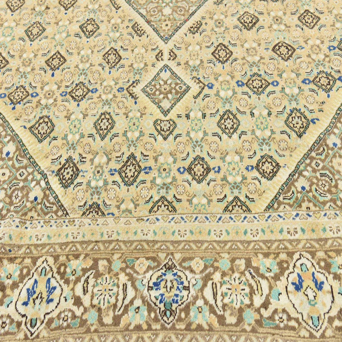 The Farahan collection presents a hand-knotted rug crafted from 100% wool, measuring 10x13 feet and offering a blend of durability and timeless appeal. This semi-antique rug, aged between 40-60 years, showcases a beige background complemented by a palette including shades of blue, black, brown, green, ivory, and navy blue. Its intricate pattern features a harmonious mix of traditional motifs that create a sophisticated diamond-shaped central medallion, bordered by detailed guard bands. Despite its age, it retains a robust presence with some areas showing low pile and discreet repairs that contribute to its story.