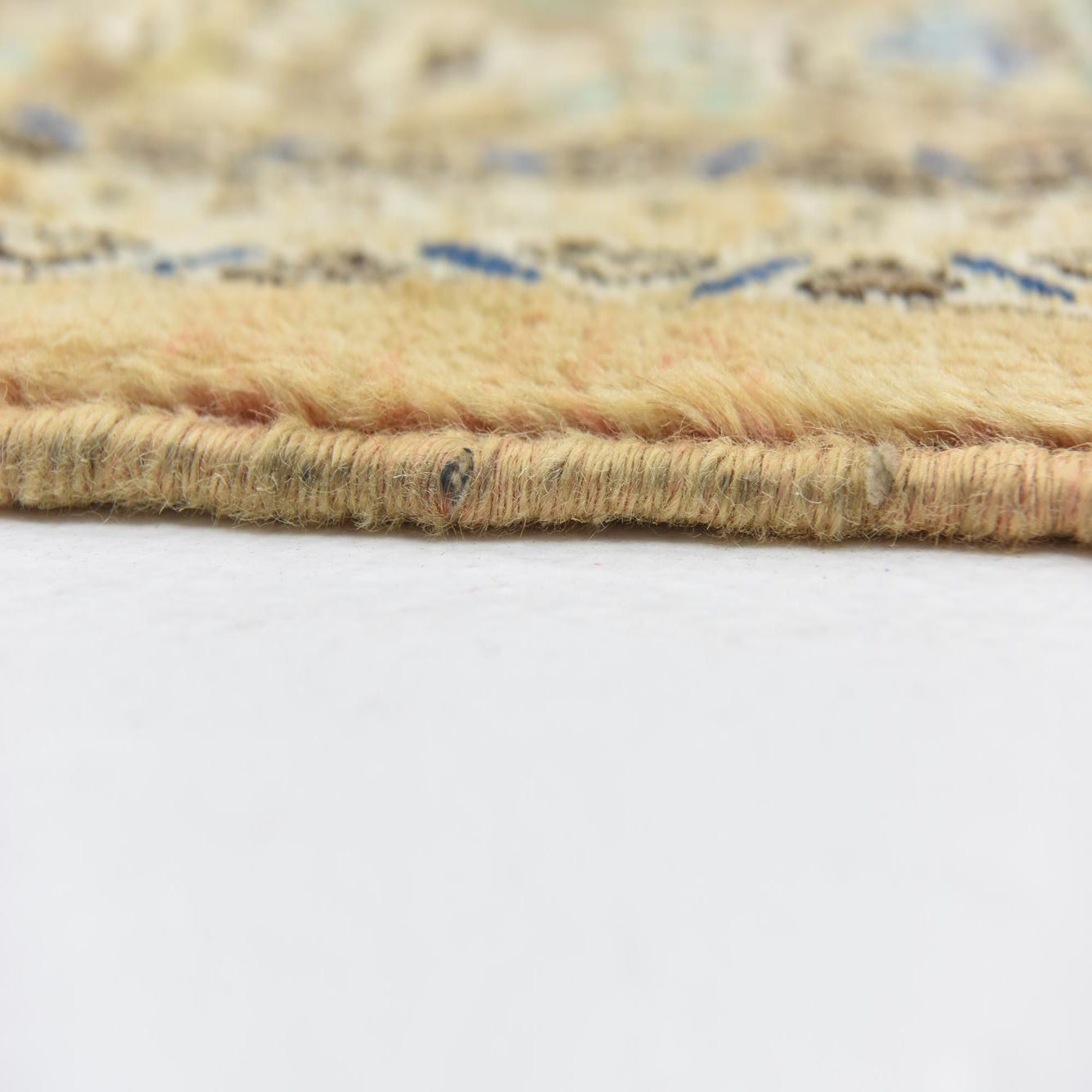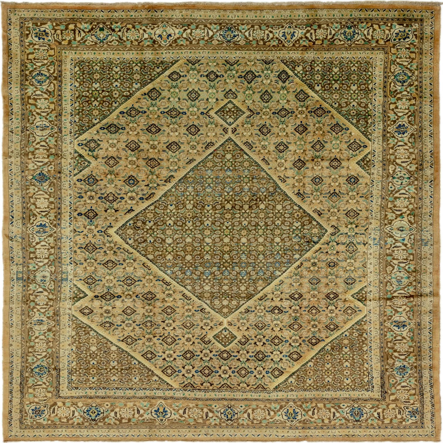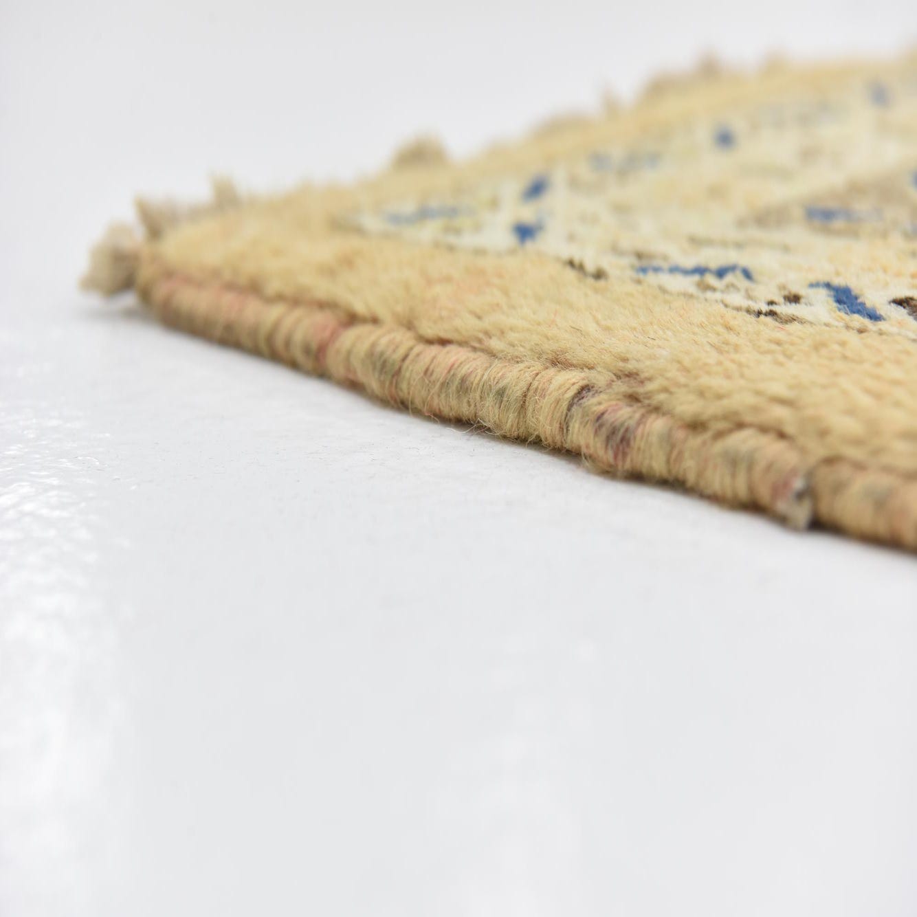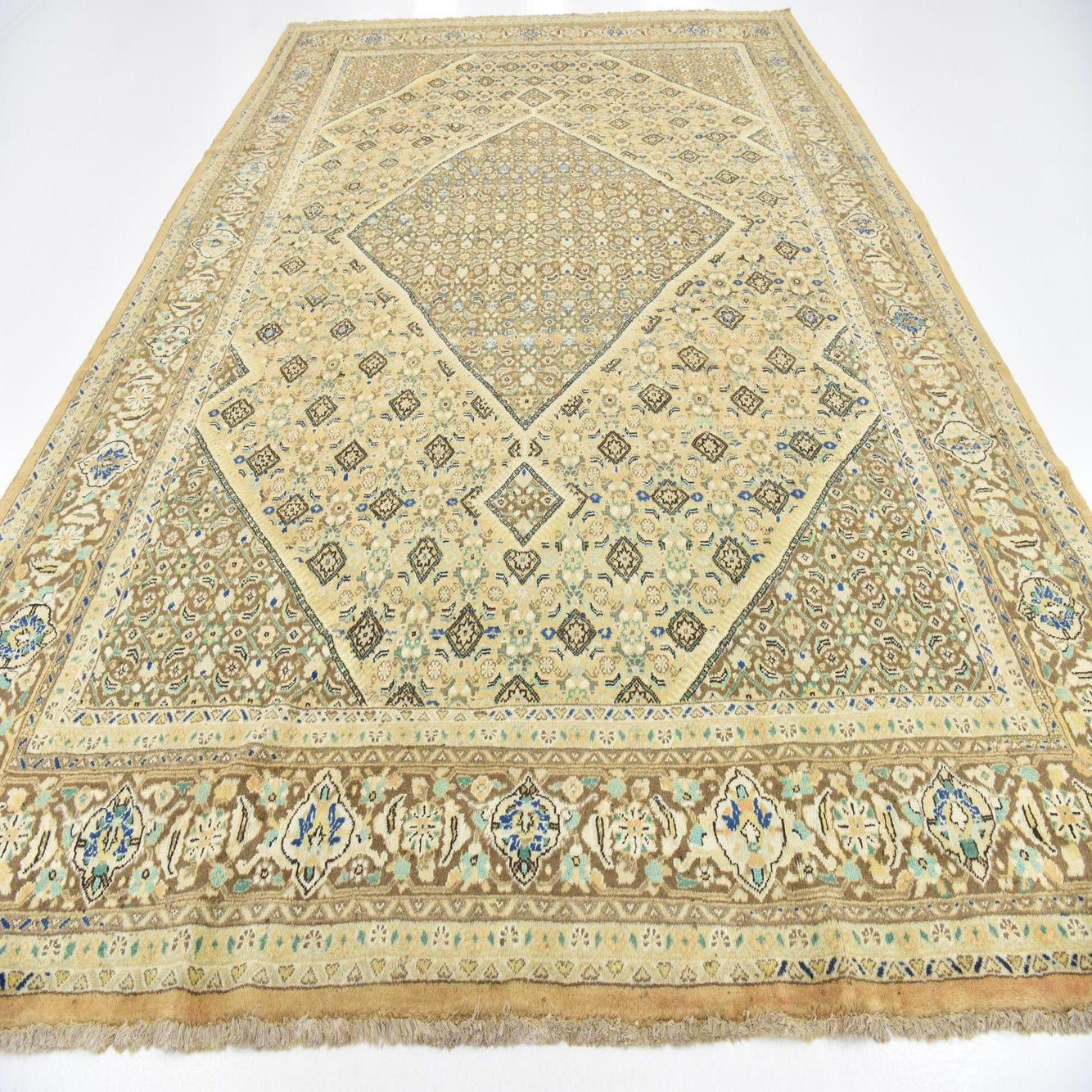 The Farahan collection presents a hand-knotted rug crafted from 100% wool, measuring 10x13 feet and offering a blend of durability and timeless appeal. This semi-antique rug, aged between 40-60 years, showcases a beige background complemented by a palette including shades of blue, black, brown, green, ivory, and navy blue. Its intricate pattern features a harmonious mix of traditional motifs that create a sophisticated diamond-shaped central medallion, bordered by detailed guard bands. Despite its age, it retains a robust presence with some areas showing low pile and discreet repairs that contribute to its story.