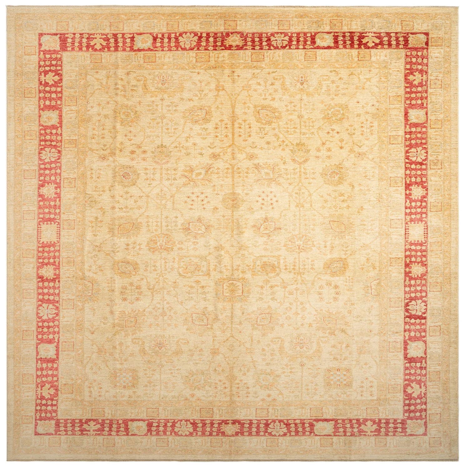 The Kaizar collection presents a hand-made 10x13 area rug crafted from 100% wool, adding both comfort and durability to its list of qualities. This particular piece features a warm beige background, complemented by additional hues of beige, red, and cream that together create a harmonious and inviting palette for any living space. The pattern is subtle, with a botanical motif that offers a timeless elegance and a sense of gentle antiquity, which is framed by a distinct, red border imbued with traditional designs.