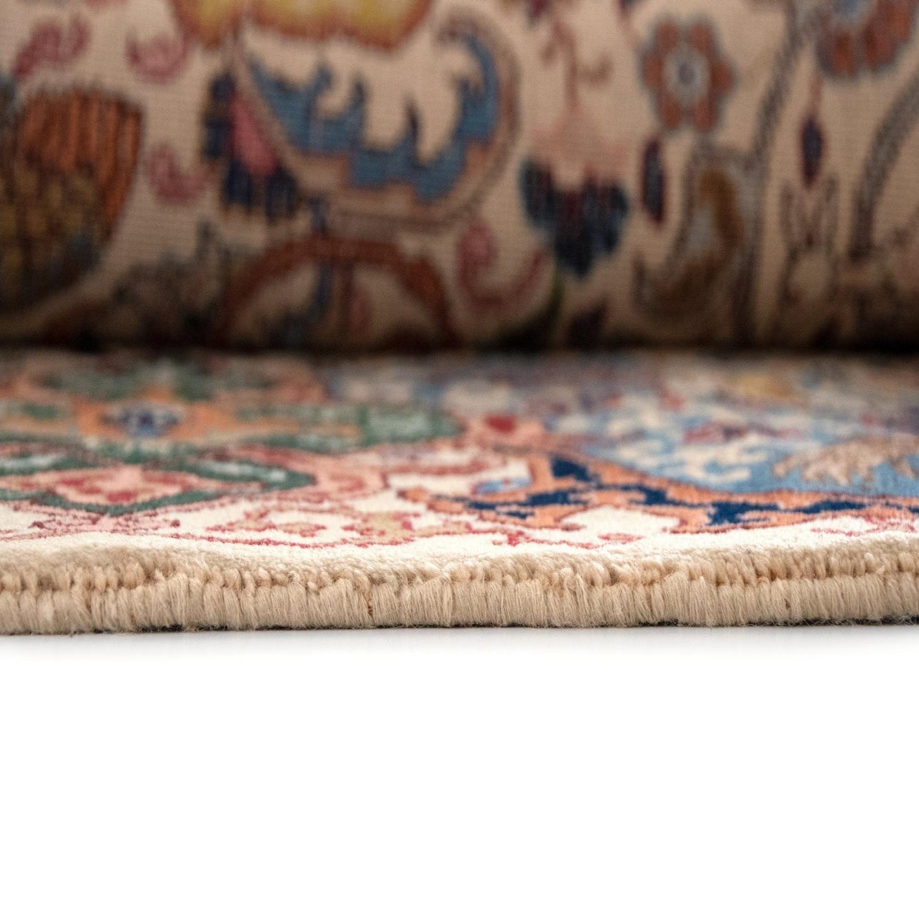 The pattern of the rug boasts a complex array of botanical motifs, centered around a bold, medallion that draws the eye inward. Its field is rendered in a versatile beige background, providing a neutral canvas that allows the intricate design work to shine. The palette includes tastefully balanced hues of brown, blue, and green, creating visual interest and depth within the design.