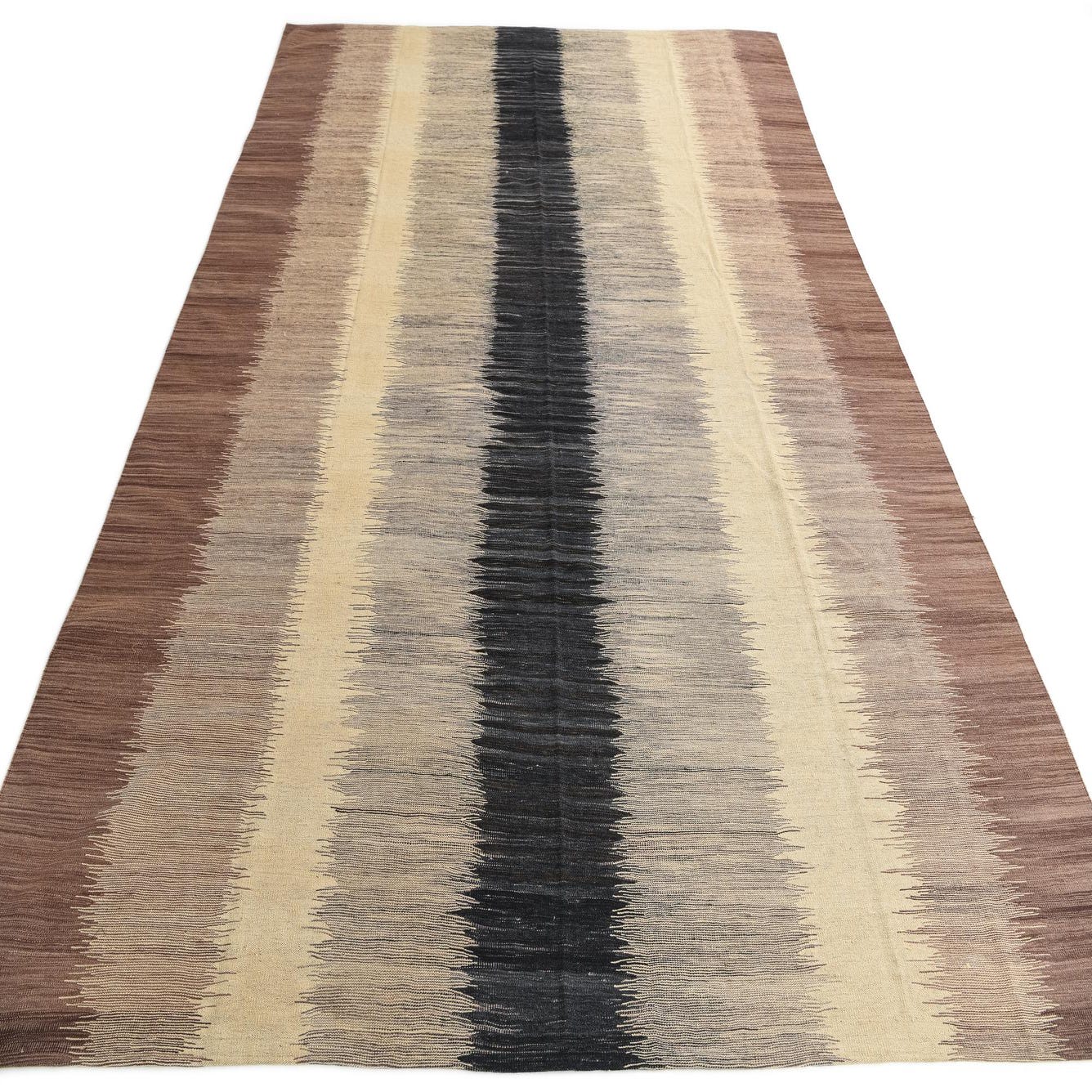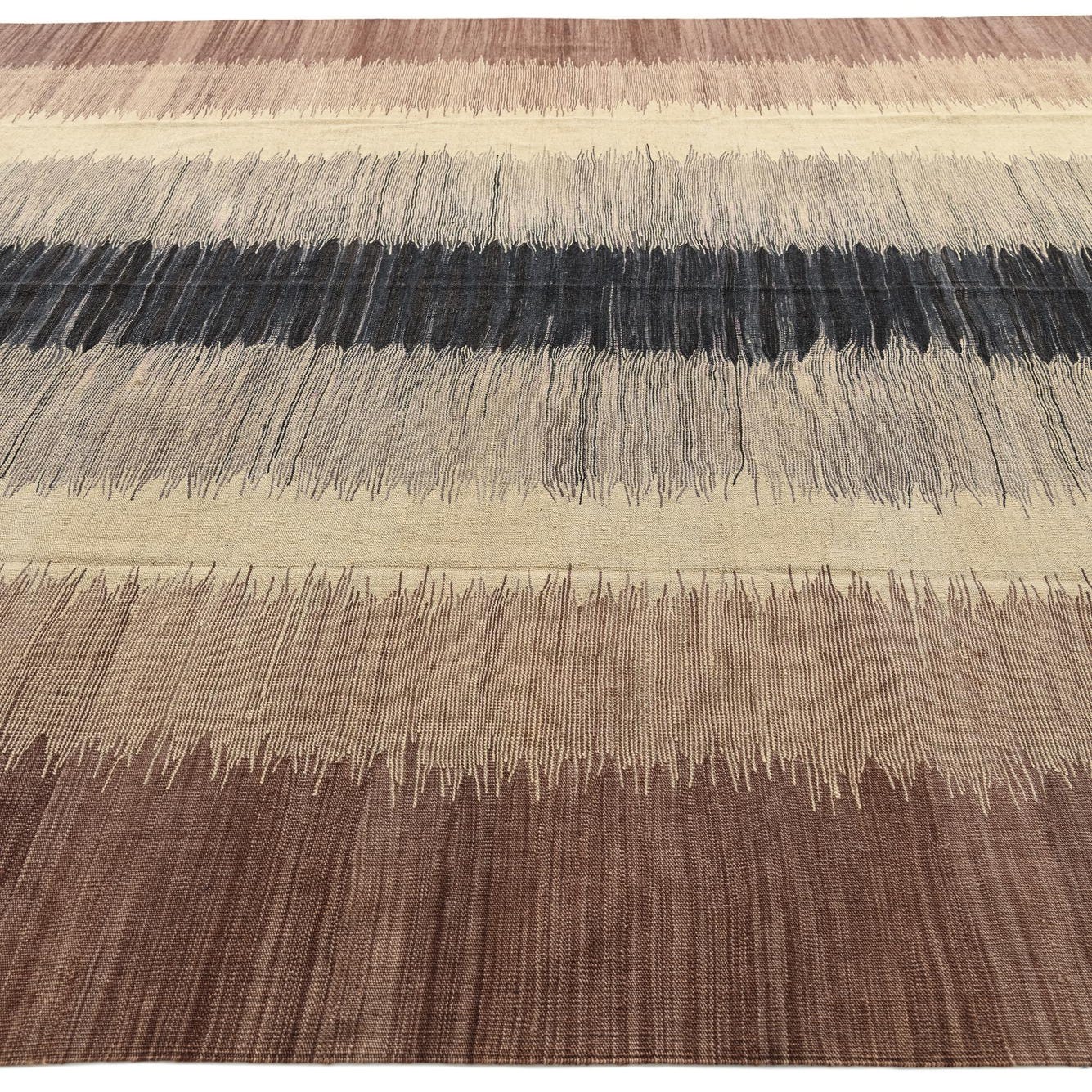 Part of our Kilim Modern Collection, this hand-woven 10x13 rug is crafted from 100% wool, ensuring lasting durability and a soft underfoot feel. The rug showcases a series of vertical stripes that create an engaging pattern of varying widths and hues. Colors in this rug include beige, black, brown, and light brown, with beige serving as the dominant background shade.