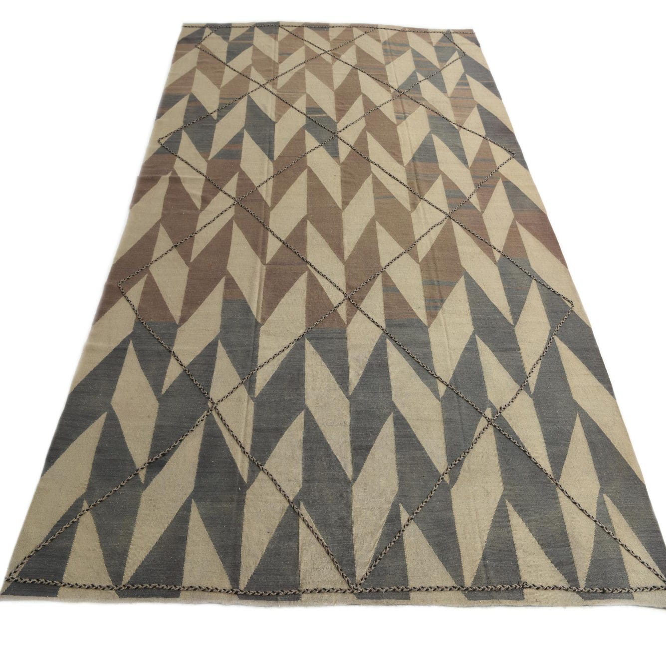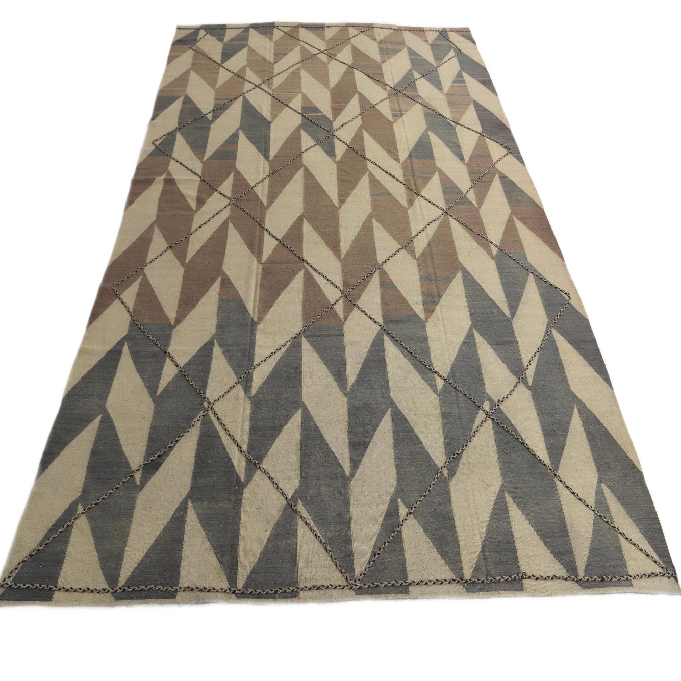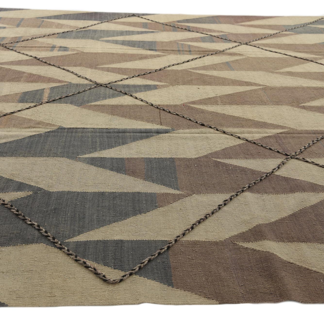 This Kilim Modern collection rug offers a 10x13 hand-woven design crafted from 100% wool, providing an authentic texture that adds depth and tactile appeal to the piece. The rug's pattern is a contemporary interpretation of traditional kilim motifs, presenting a dynamic geometric arrangement that creates a sense of movement and interest. The interplay of beige, light brown, and gray tones allows for versatile styling, with the beige background providing a neutral base that complements a wide array of color palettes.