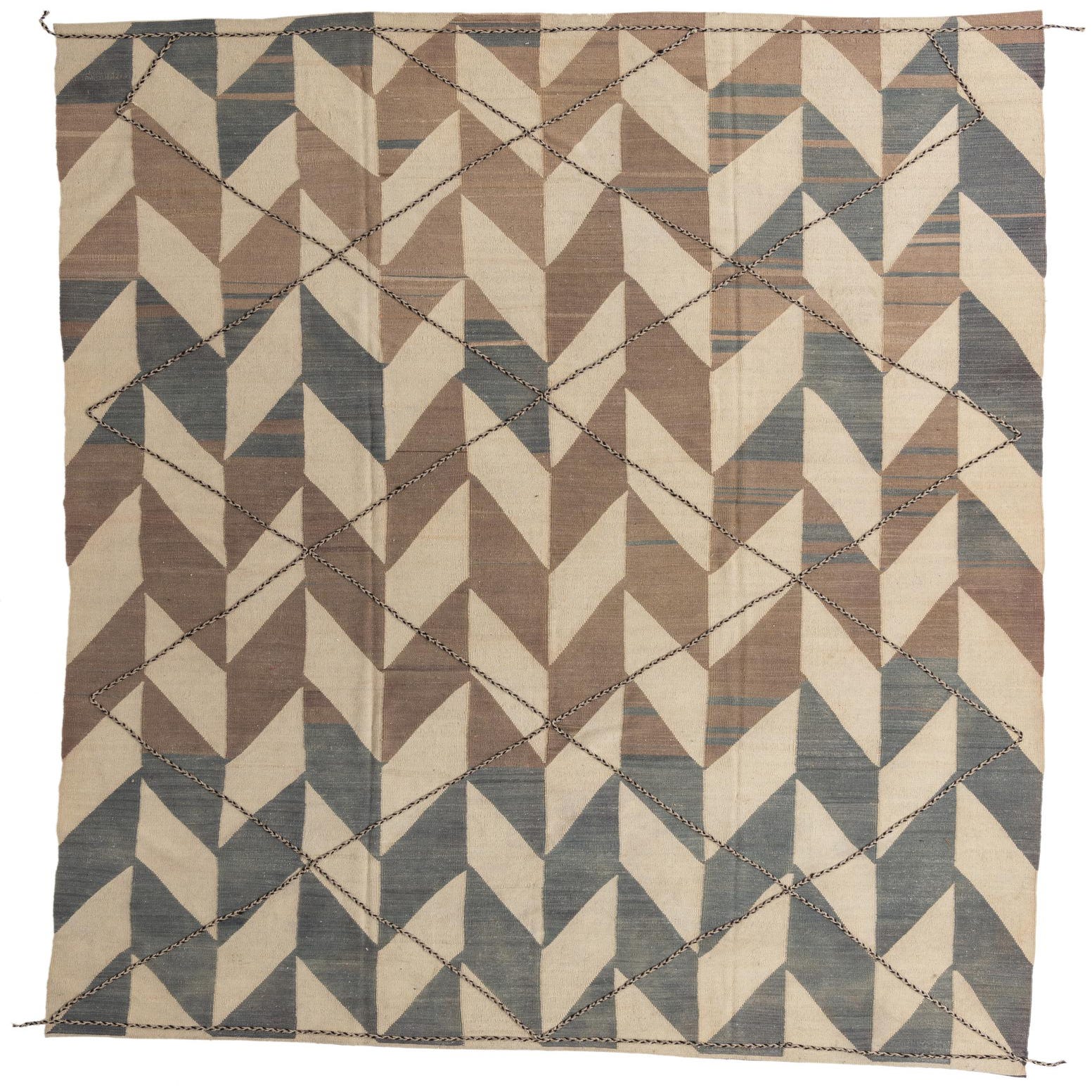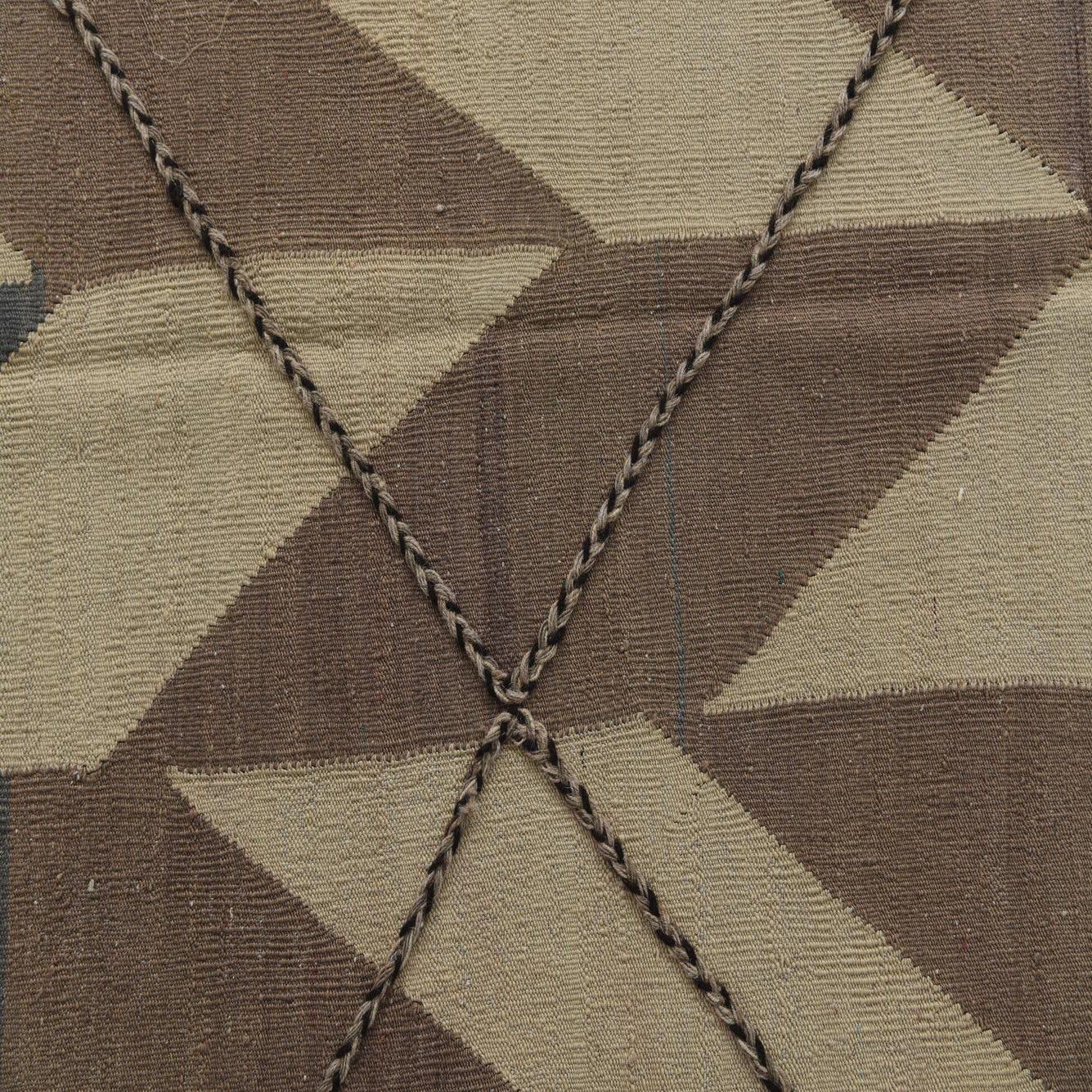 A 10x13 rectangular Kilim Modern wool rug featuring a tribal geometric pattern in browns, tans, and ivories.