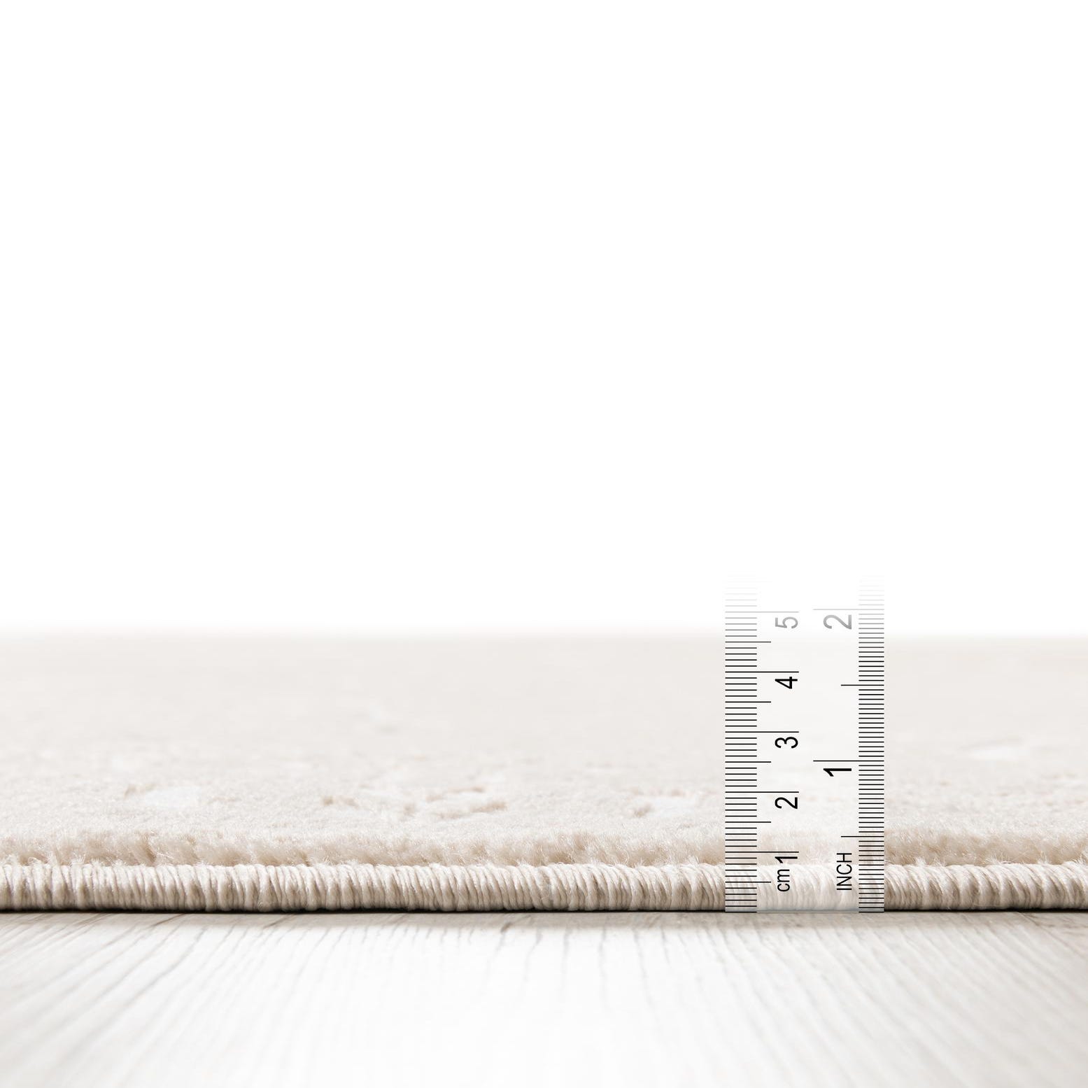 A soft, low-profile rug with a vintage-inspired medallion and scrolling arabesque motif in ivory rests on a warm beige ground. The symmetrical pattern and decorative border create a refined, transitional look that balances traditional detailing with clean, contemporary lines. Ivory highlights sit slightly raised against the beige background, giving the design clarity without high contrast.