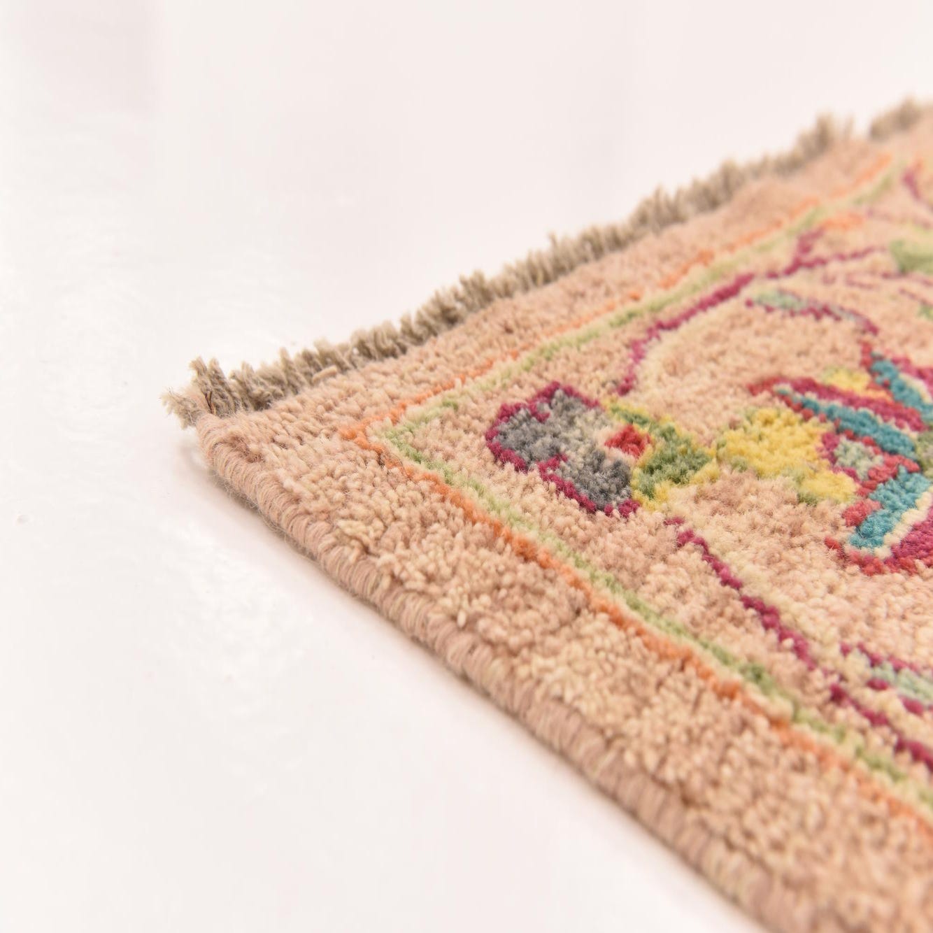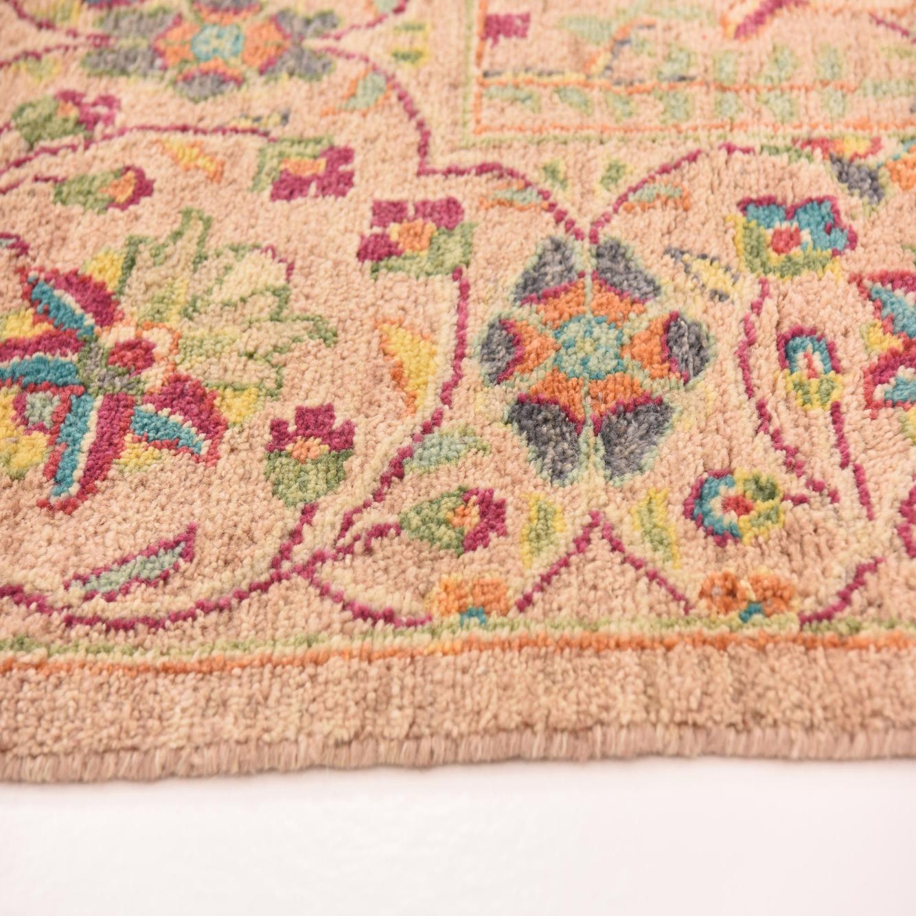 The rug's texture is inherently rich, with the plushness and durability that only hand-knotted 100% wool can provide. The inclusion of fringe adds an additional element of classic style and finish to the piece. The design and color scheme make it highly versatile, suitable for a variety of interior design scenarios, from traditional to more eclectic and globally inspired decor. It can serve as a focal point in a living room, dining room, or large open space, adding warmth and a sense of history to the environment.