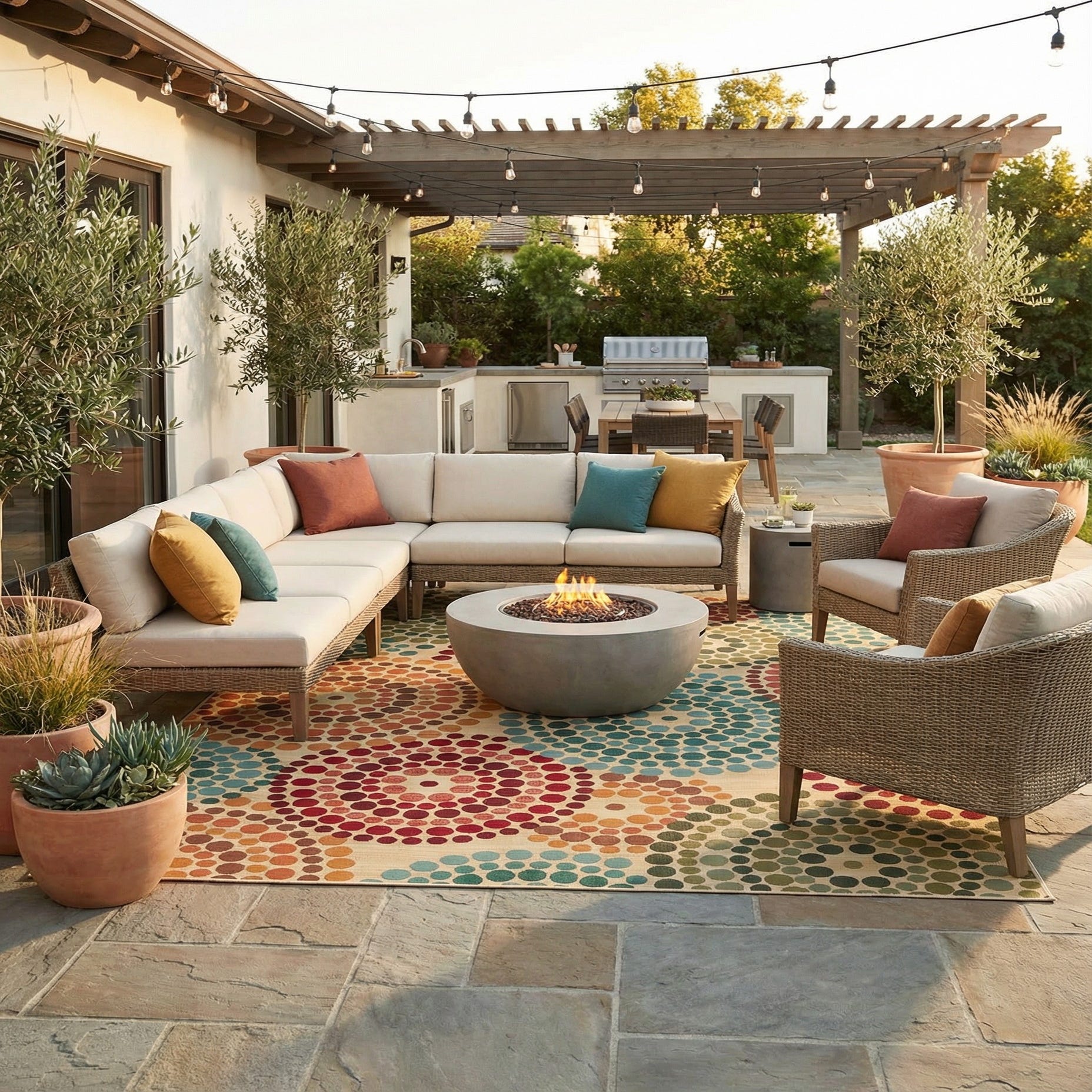 This rug suits contemporary and transitional settings where pattern and color are welcome. Use it to anchor an alfresco dining area on a covered patio, define a casual living room seating arrangement, or brighten a sunroom with coordinated pillows and natural-wood accents. Pair it with neutral sofas to let the medallions take center stage, or tie it into mid-century and eclectic schemes by echoing the blue and red tones in small accessories.