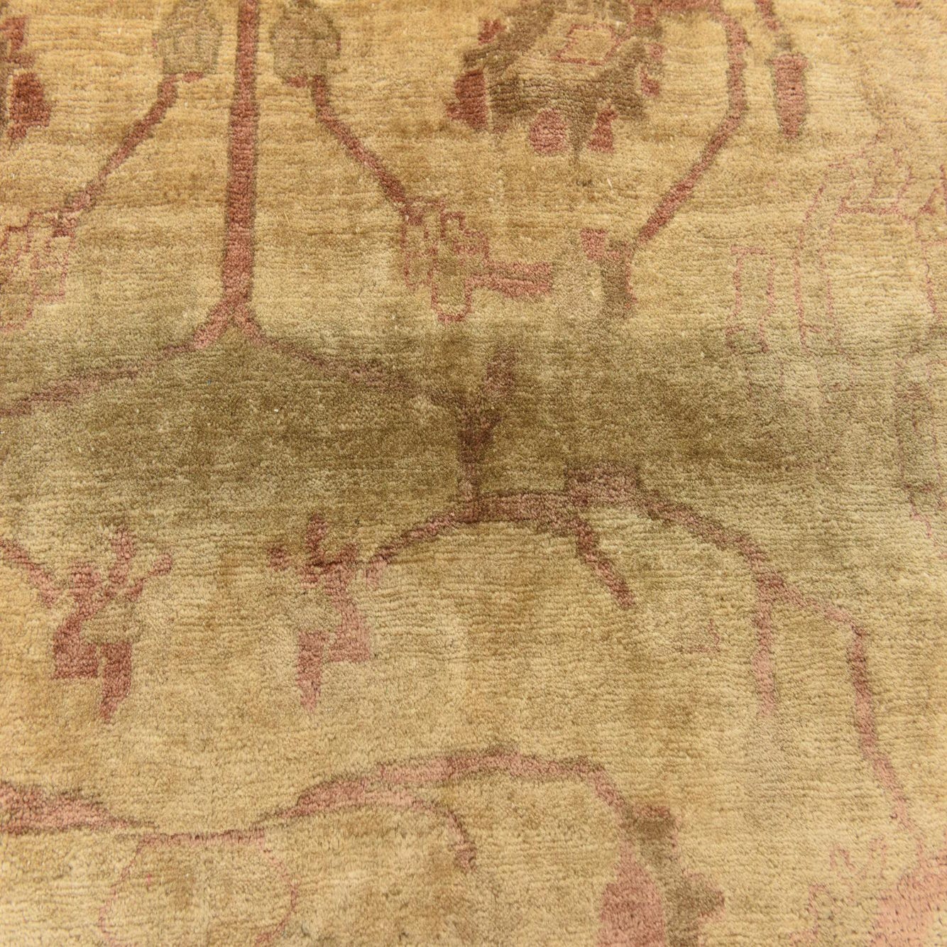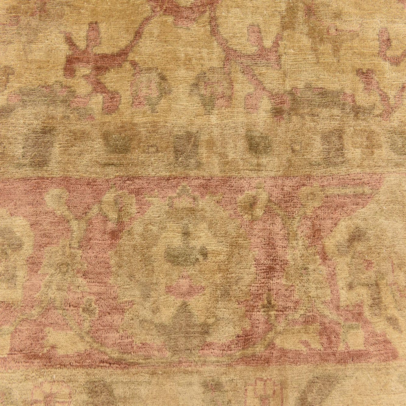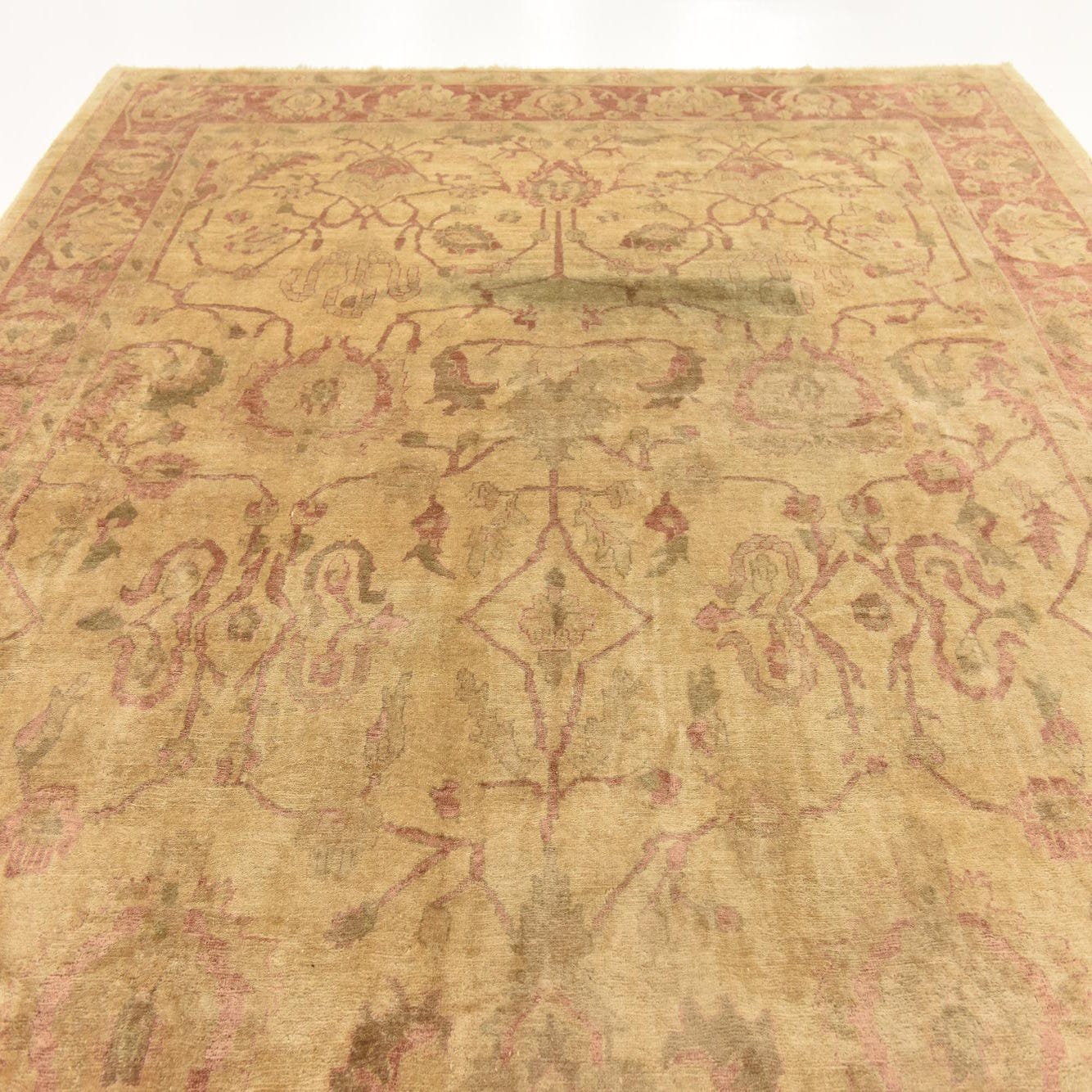This Peshawar Ziegler rug, hand-knotted from 100% hand-spun wool, presents a harmonious blend of beige, olive, and rust red hues that elegantly come together to showcase its traditional design. The rug spans a substantial 10x13 feet, making it a substantial addition to any space. Its primary beige background is gracefully adorned with a classic pattern featuring botanical motifs and intricate borders that evoke a timeless aesthetic.