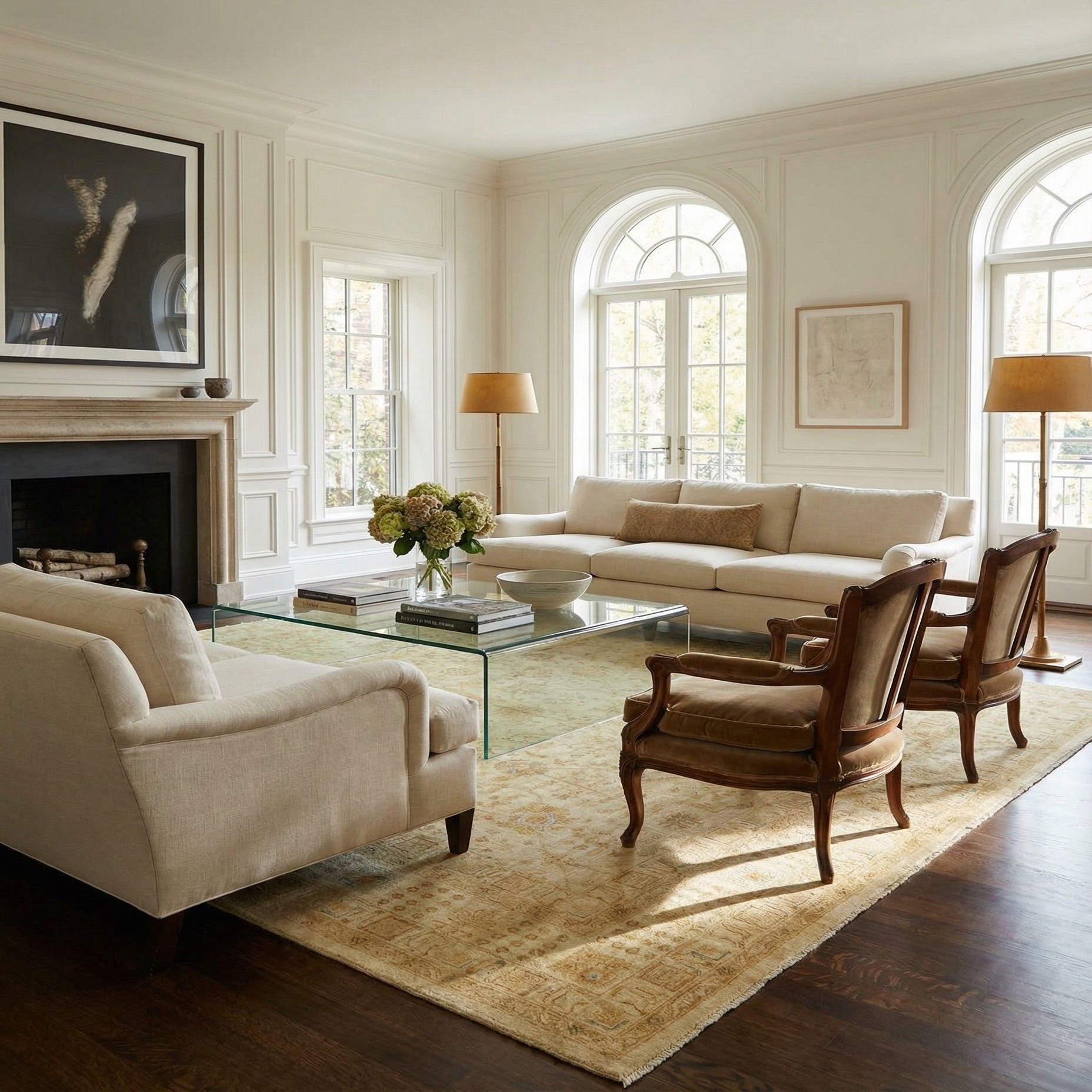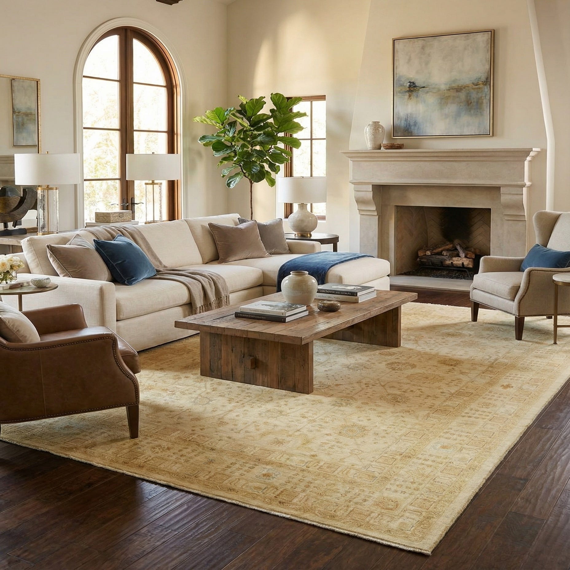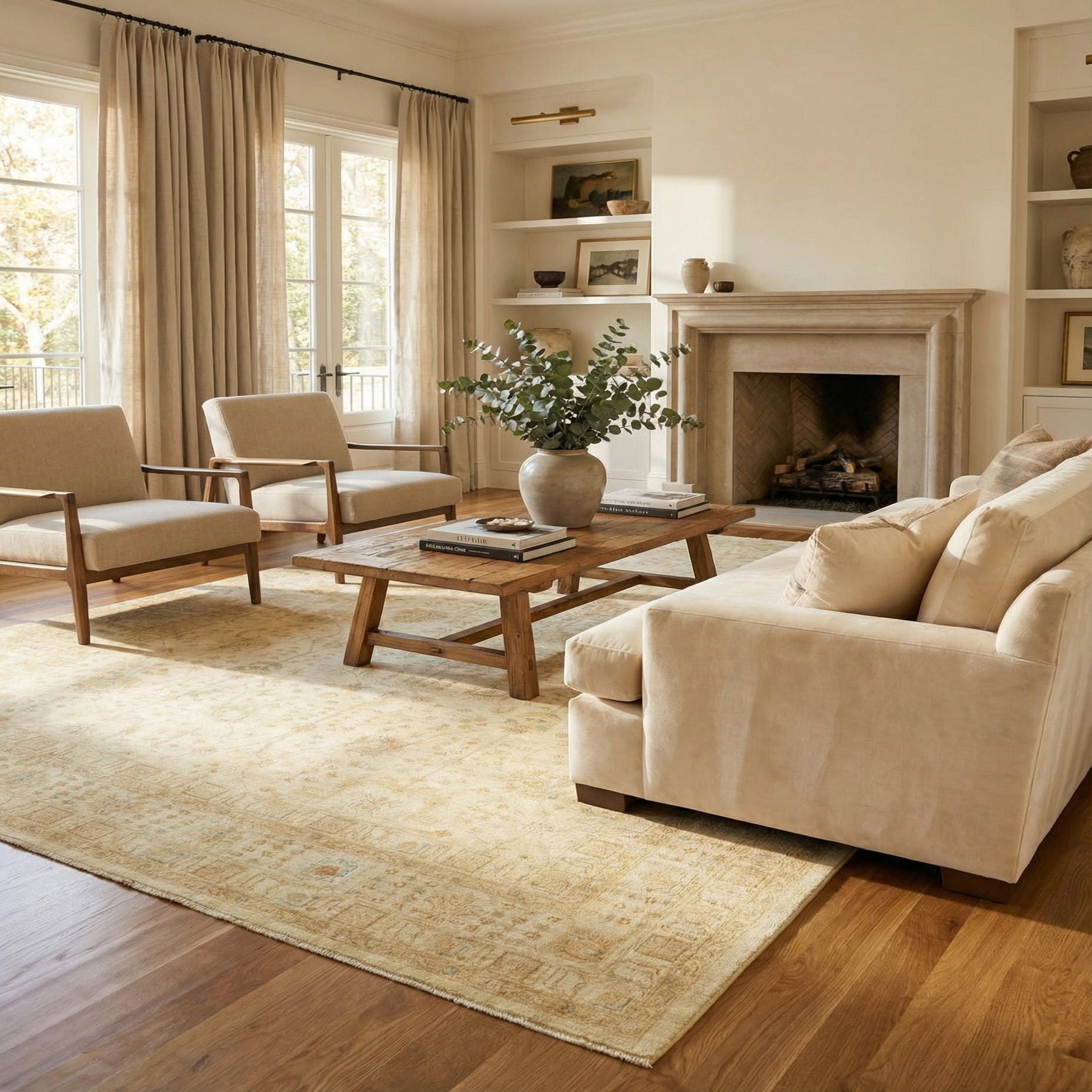 Its restrained palette and refined pattern work well in a range of interiors. Place it beneath a large seating group in a living room to anchor furniture without overwhelming the space, under a dining table to soften a traditional dining area, or in a master bedroom to provide a warm, layered base. It pairs naturally with warm woods, linen or leather upholstery and brass or aged-metal accents, and fits equally well in classic, transitional, or softly rustic schemes.