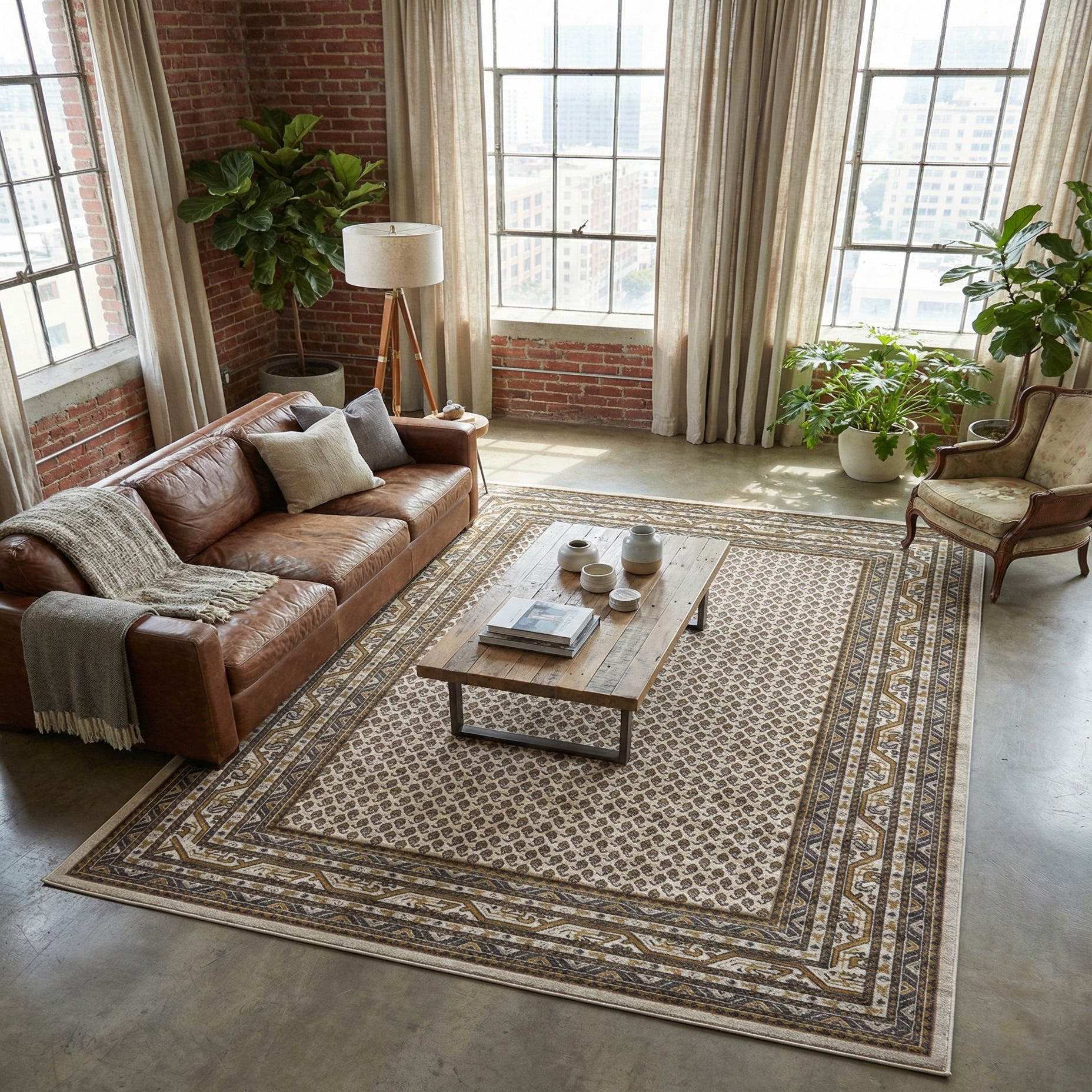 This piece works well under a living room seating group or beneath a dining table to anchor a large arrangement, and it also functions nicely in an office or formal entry where a refined pattern is wanted without heavy color contrast. Pair it with warm wood furniture and neutral upholstery, introduce gold or brass accents to echo the gold highlights, or layer with textured linens and gray throw pillows for a balanced, layered look.