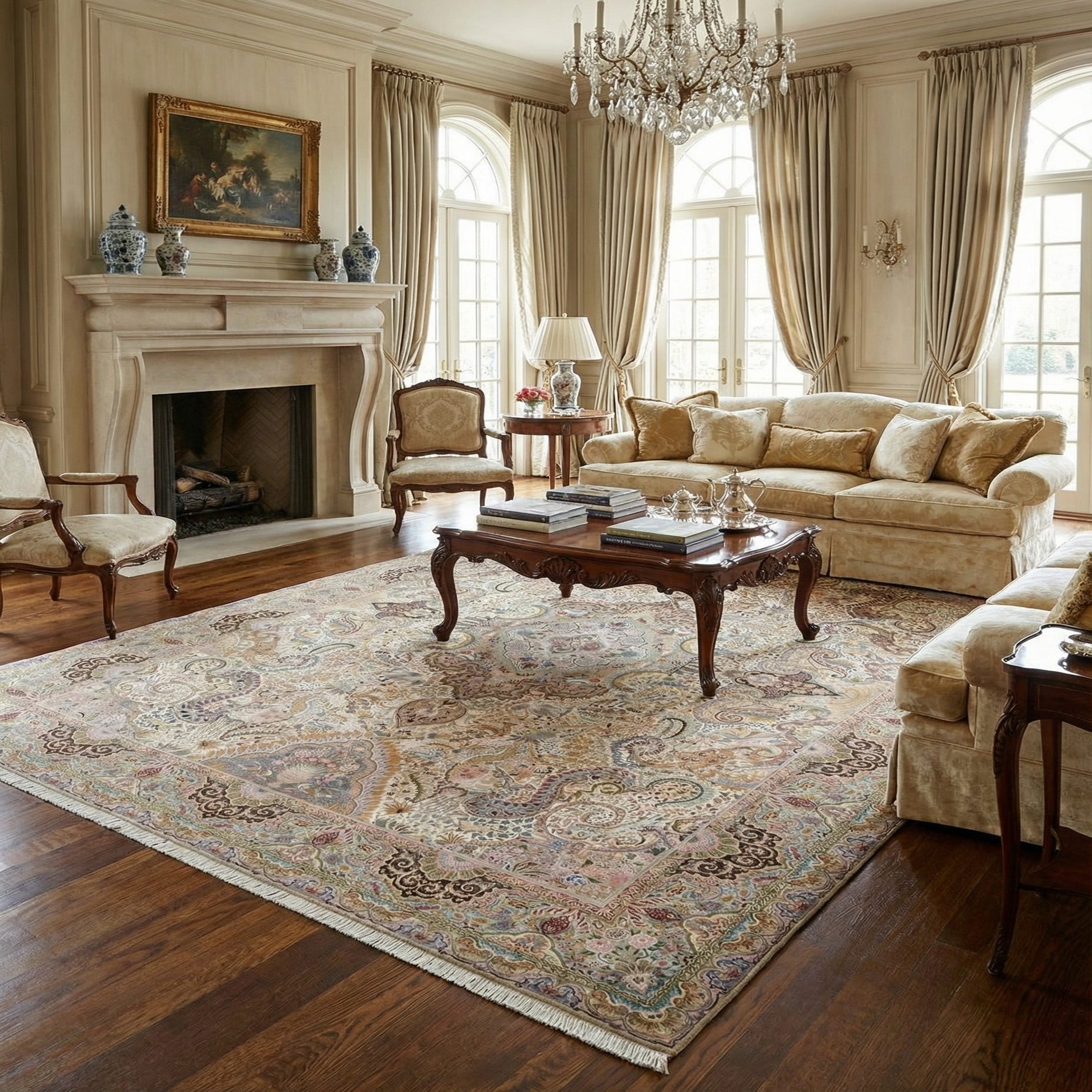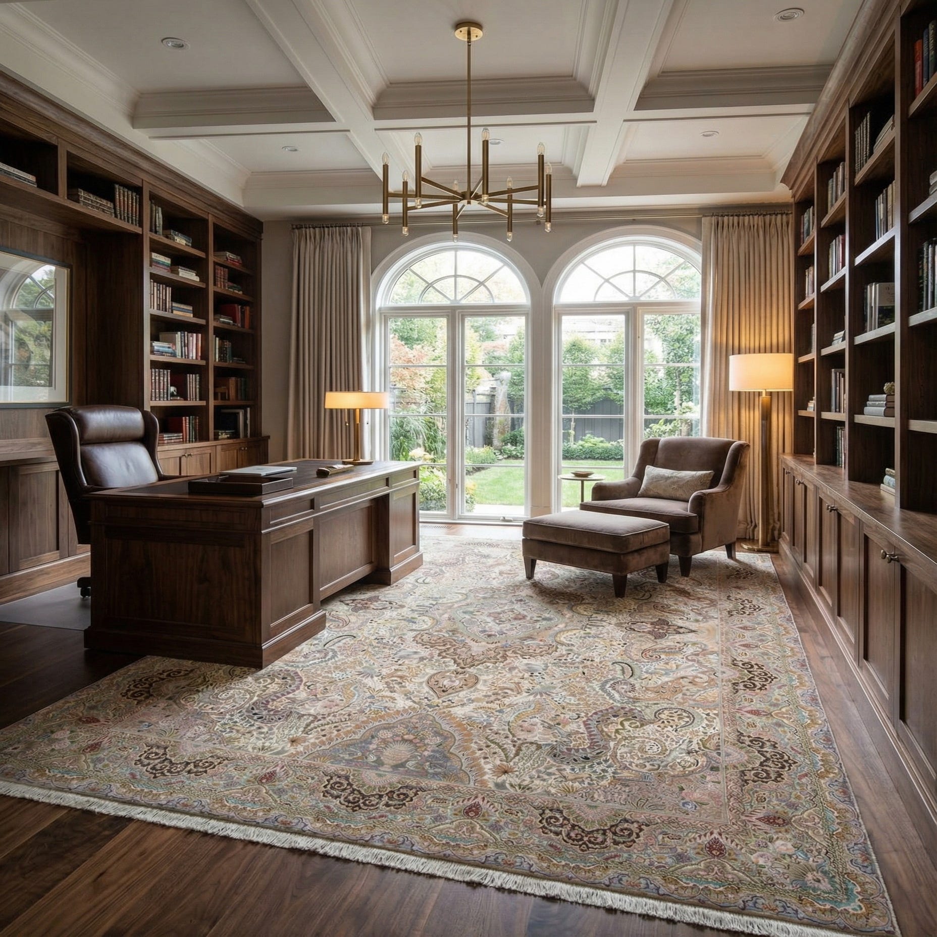 Place this rug under a formal seating area or beneath a dining table to anchor a traditional or transitional room; it also works well in a library or entry where pattern and texture set the tone. It pairs naturally with warm wood furniture, neutral upholstery and accent pillows in olive or light blue, and can soften contemporary settings when layered with simpler, modern furnishings.